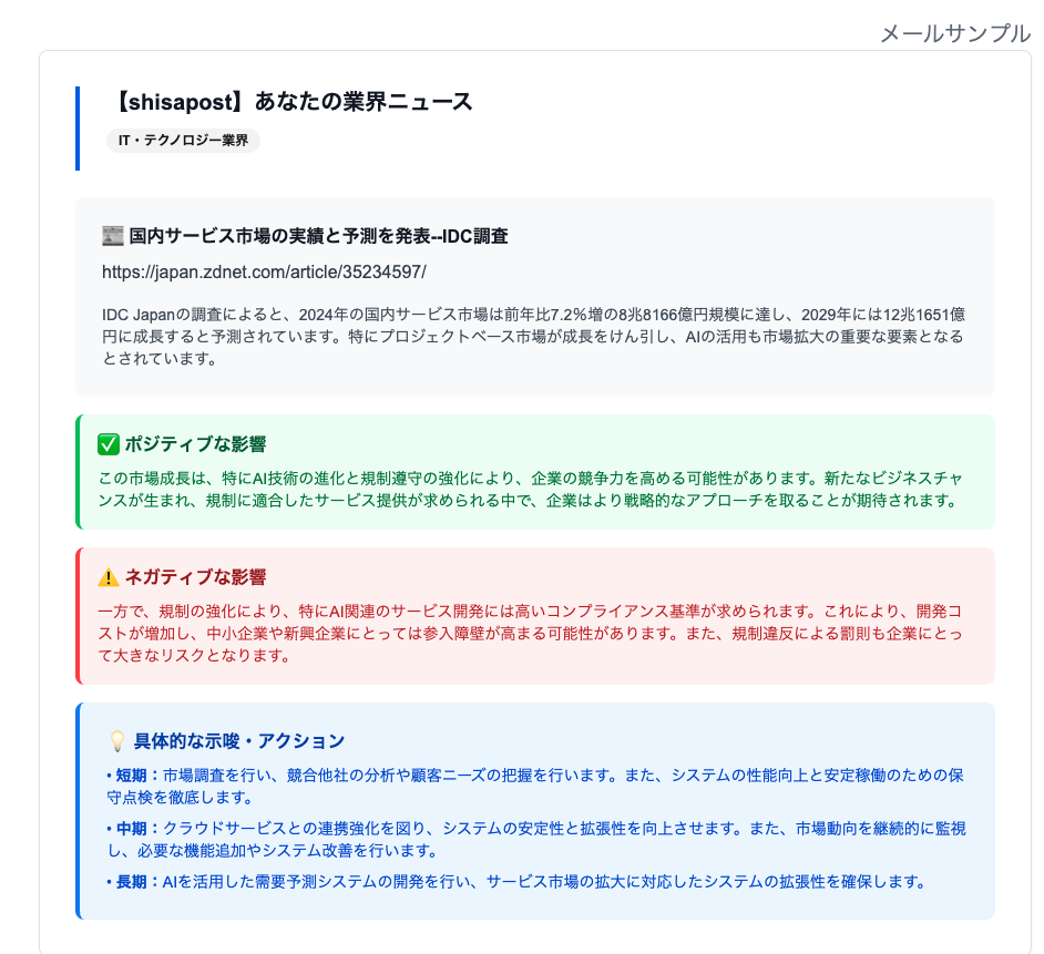 shisapostは、あなたの仕事や業界に特化した最新ニュースの概要、ポジティブ・ネガティブ双方からの影響分析、そして具体的な示唆を毎朝メールでお届け。単純なニュースの要約ではなく次のアクションまで提案してくれます!エンジニア仲間と少数チームで開発しました。