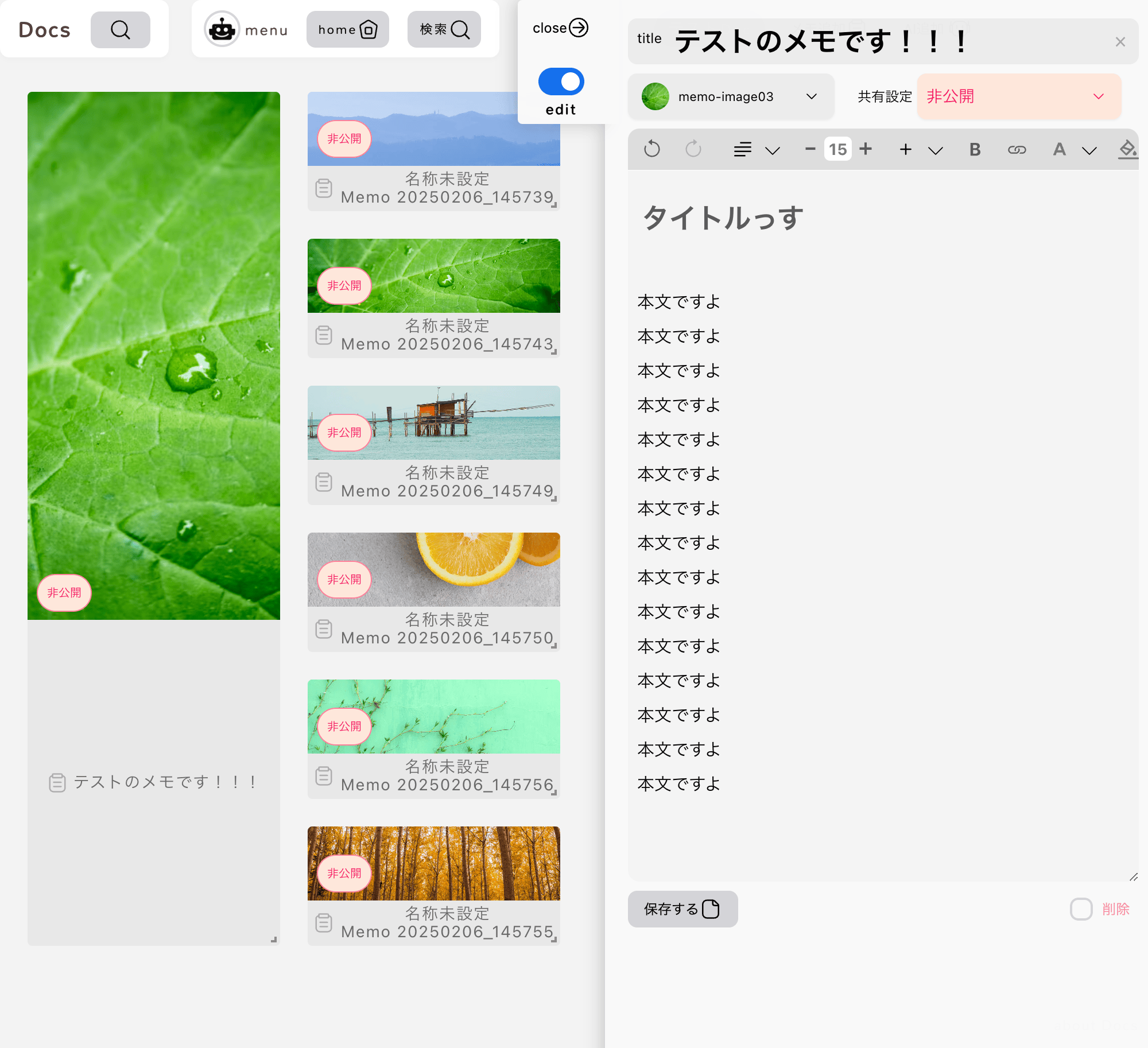 Docsとは? 「書く、読む、伝える、をもっと楽しく」をコンセプトにweb情報発信・共有するためのプラットフォームです。 グリッドレイアウト上に自分だけのメモを自由に配置できます。