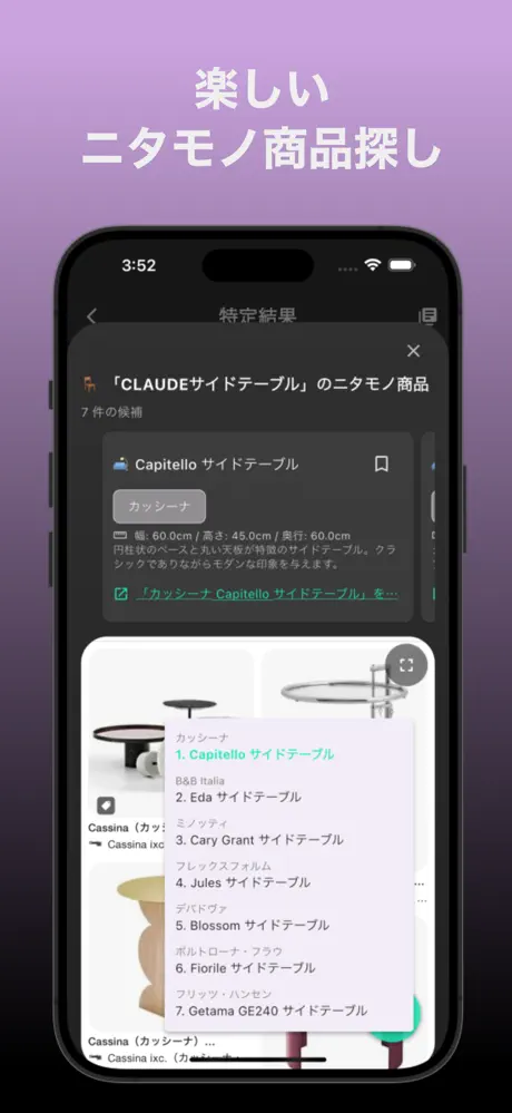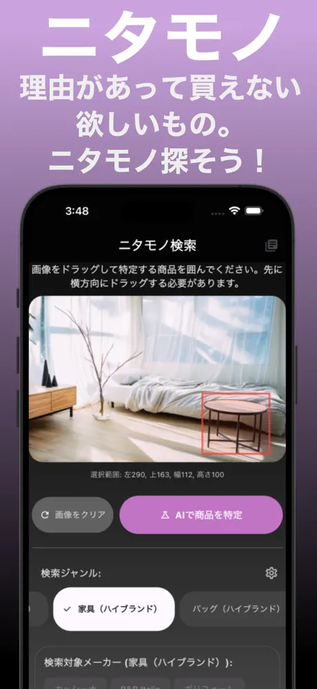 画像から商品を特定してその商品のニタモノを探すアプリです。登録された400以上のブランドからニタモノが探せます。