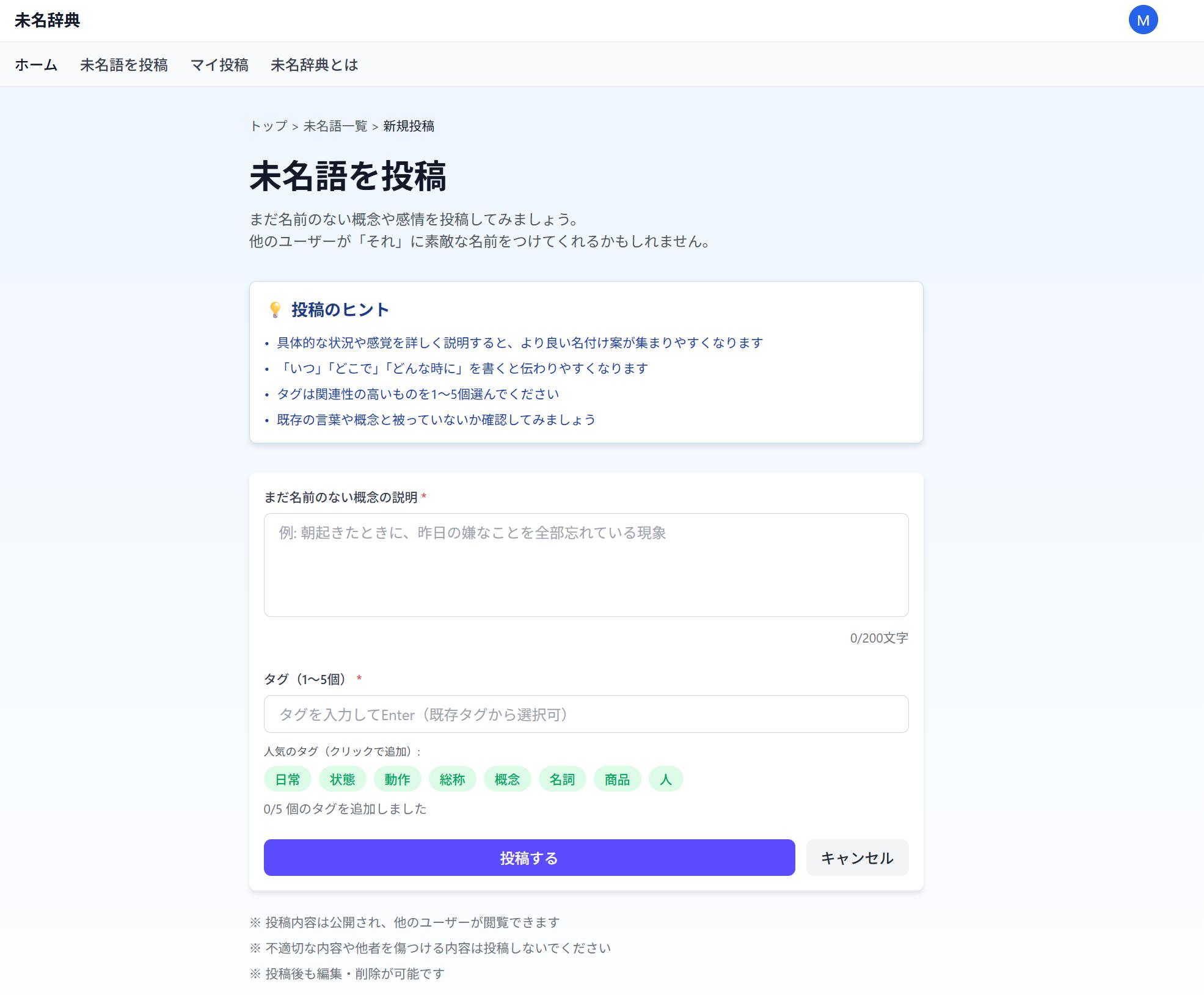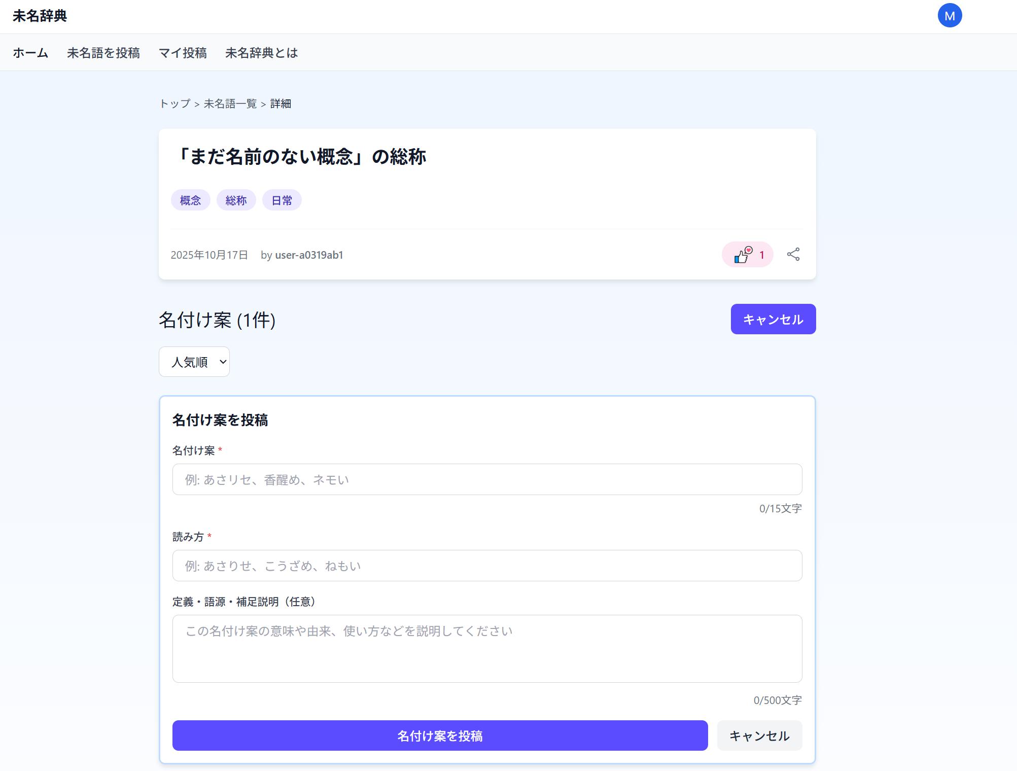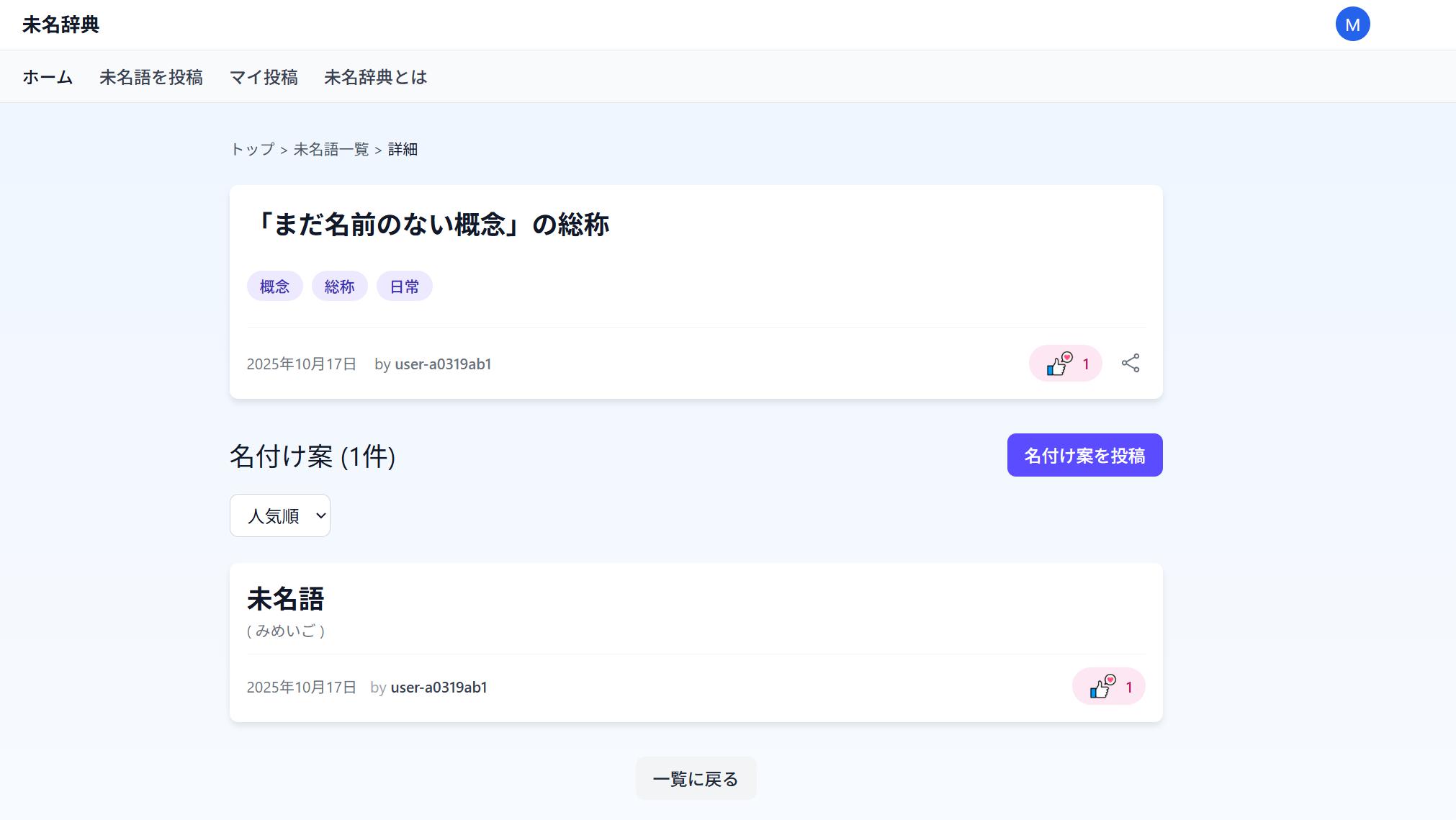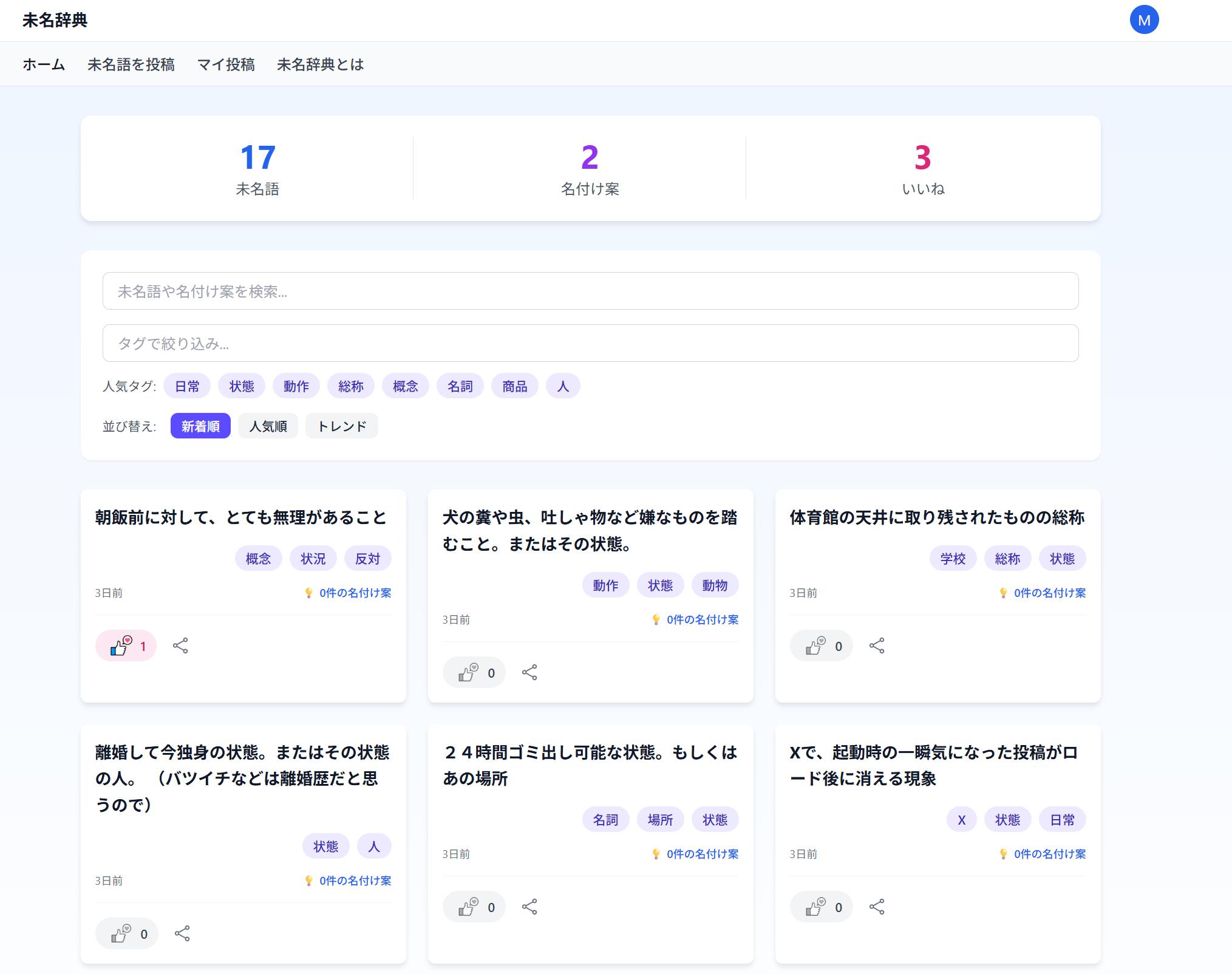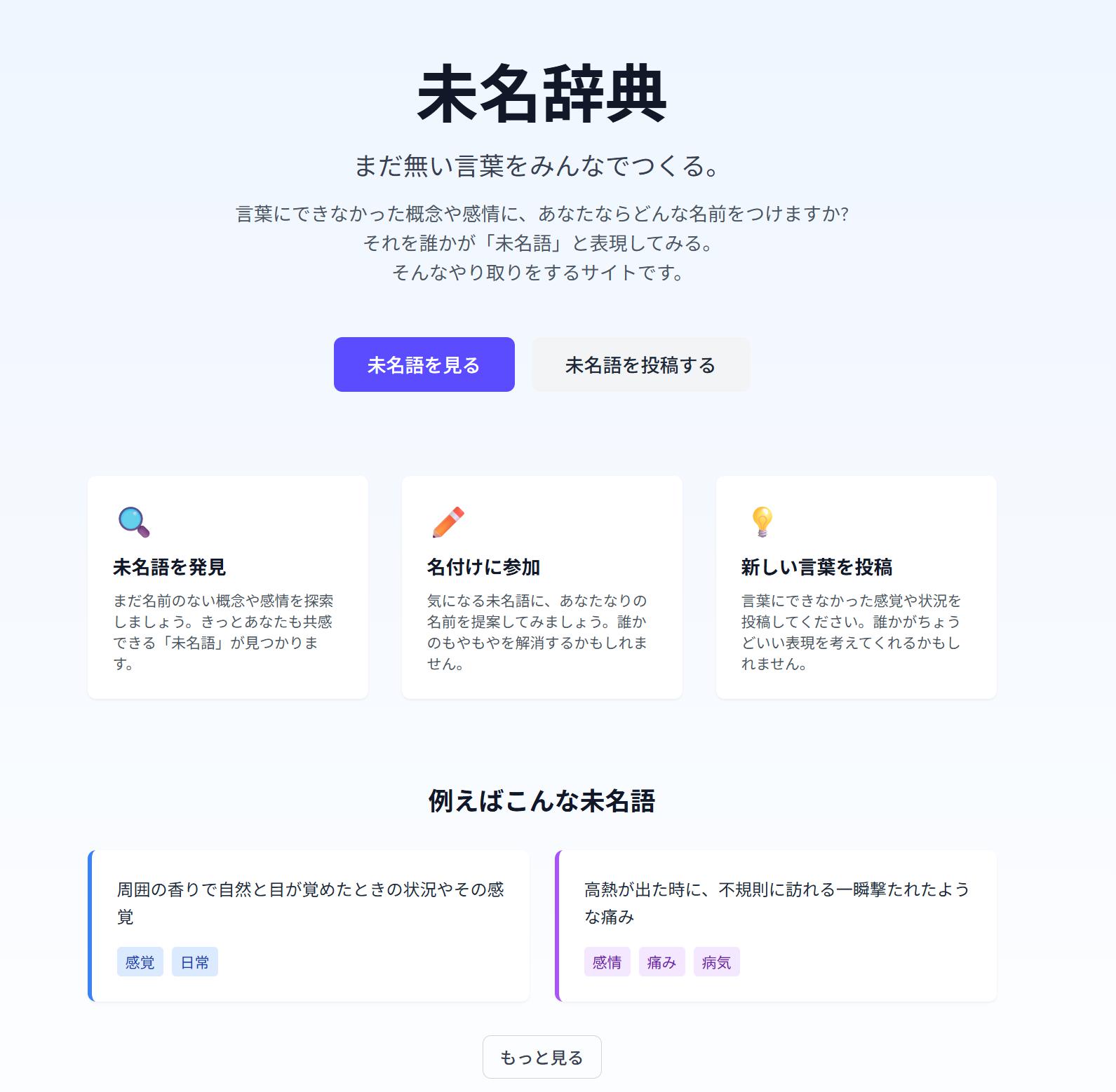 言葉にできなかった概念や感情に、あなたならどんな名前をつけますか? それを誰かが「未名語」と表現してみる。 そんなやり取りをするサイトです。