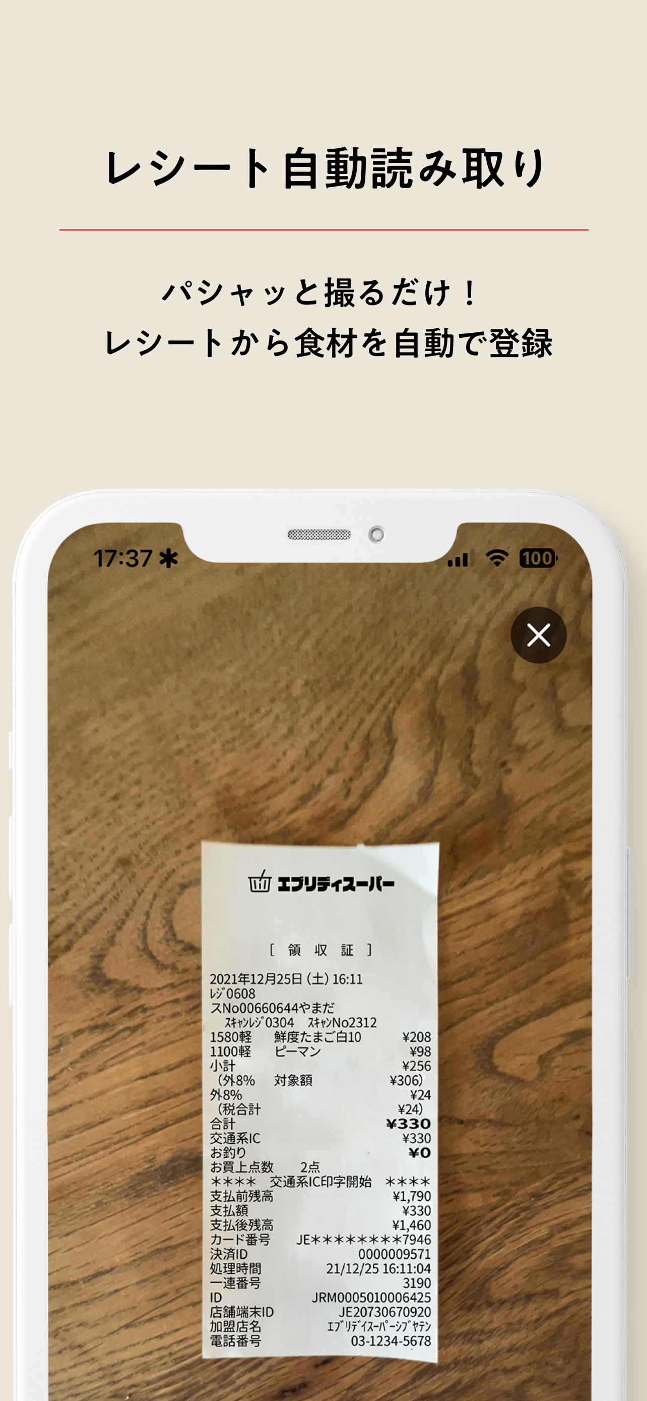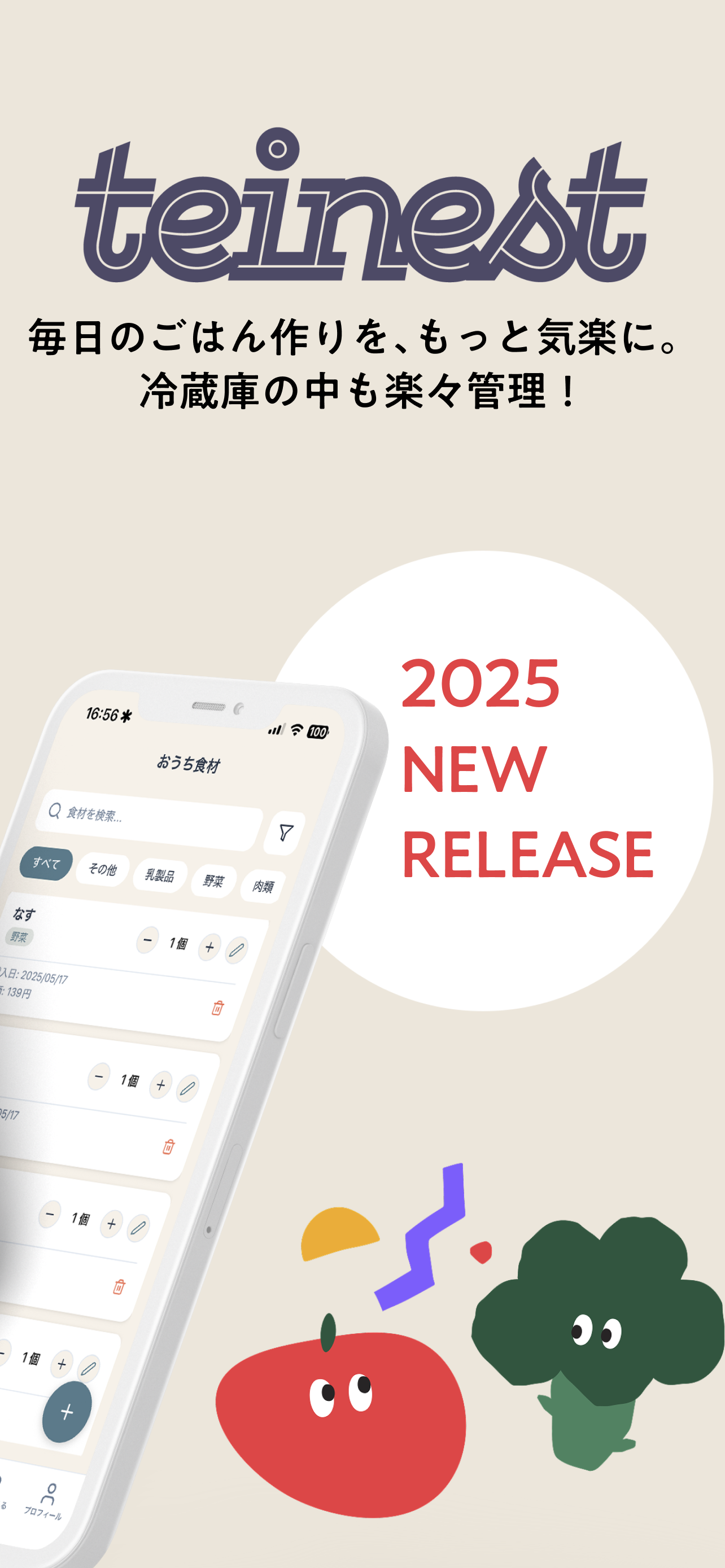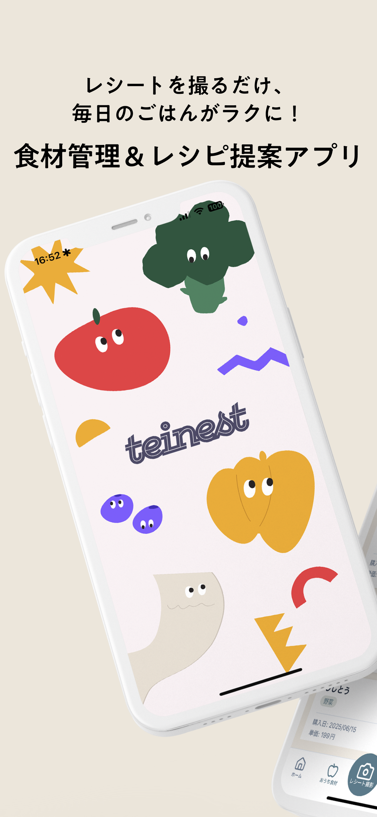 レシートを撮るだけで、冷蔵庫の中からサクっとレシピ提案 【こんなことで困っていませんか?】 「冷蔵庫にある食材で何を作ればいいか分からない」 「せっかくの食材を使いきれず、気づいたら傷んでしまう...」 「同じ食材が家にあるのに、間違えて買ってしまった」 >>そんな悩みを解決するのが Teinest(テイネスト) です。 【アプリの特徴】 ・レシートを撮影するだけで、食材を自動登録。面倒な入力は不要! ・冷蔵庫にある食材からレシピを提案。初心者でも「今日のごはん」がすぐ決まります。 ・家族やパートナーと食材を共有。買いすぎ・ダブり買いを防止。 【Teinestがあると、こんないいことが】 献立を考える手間が減って、料理がラクになる 料理初心者でも、同じ食材をうまく使い回せるアレンジレシピがわかる 食材を無駄にせず、エコでお財布にもやさしい パーティやまとめ買いの後も、使い切りレシピですっきり 外出先でも冷蔵庫の中が見えて、「これ家にあったっけ?」がなくなる 【開発者の思い】 「冷蔵庫に食材があるのに、結局コンビニや外食で済ませてしまう」 「レシピをいちいち調べるのも面倒で、途中で足りない食材に気づいて、やる気をなくす」 「冷蔵庫にある野菜をまた買って、使いきれず捨ててしまった」 そんな自分の日常の小さな“つまずき”から、このアプリを作りました。 Teinestは、料理が得意じゃなくても、楽しく・無理なく・ていねいに食材を使い切れるようにするための小さな相棒です。 忙しい毎日の中でも、楽しく・気軽にごはんを作れるように。 便利さだけじゃなく「ちょっと気持ちが軽くなる」アプリを目指しています。 一人暮らしでも、二人暮らしでも、家族や友達とでも。 このアプリが、みなさんの暮らしを少しやさしく、ちょっと楽しくできたら嬉しいです。 【オプション権限】 ・カメラ(レシート読み取りに使用) ・写真(撮影したレシートを保存/読み込みに使用) ・通知(食材の消費期限リマインドに使用) ・対応端末:iOS 15.0以降。iPhone・iPad 対応。 ・年齢制限:13+ ・アプリ内課金:なし(将来的にプレミアム機能追加予定) 【最後に】 個人で開発しているからこそ、使ってくださる方の声を大切に育てていきたいです。 もし気に入っていただけたら、ぜひレビューをお待ちしております。 改善してほしいところや「こんな機能があったら便利!」というアイデアも、ぜひコメントで教えていただけると大喜びします。