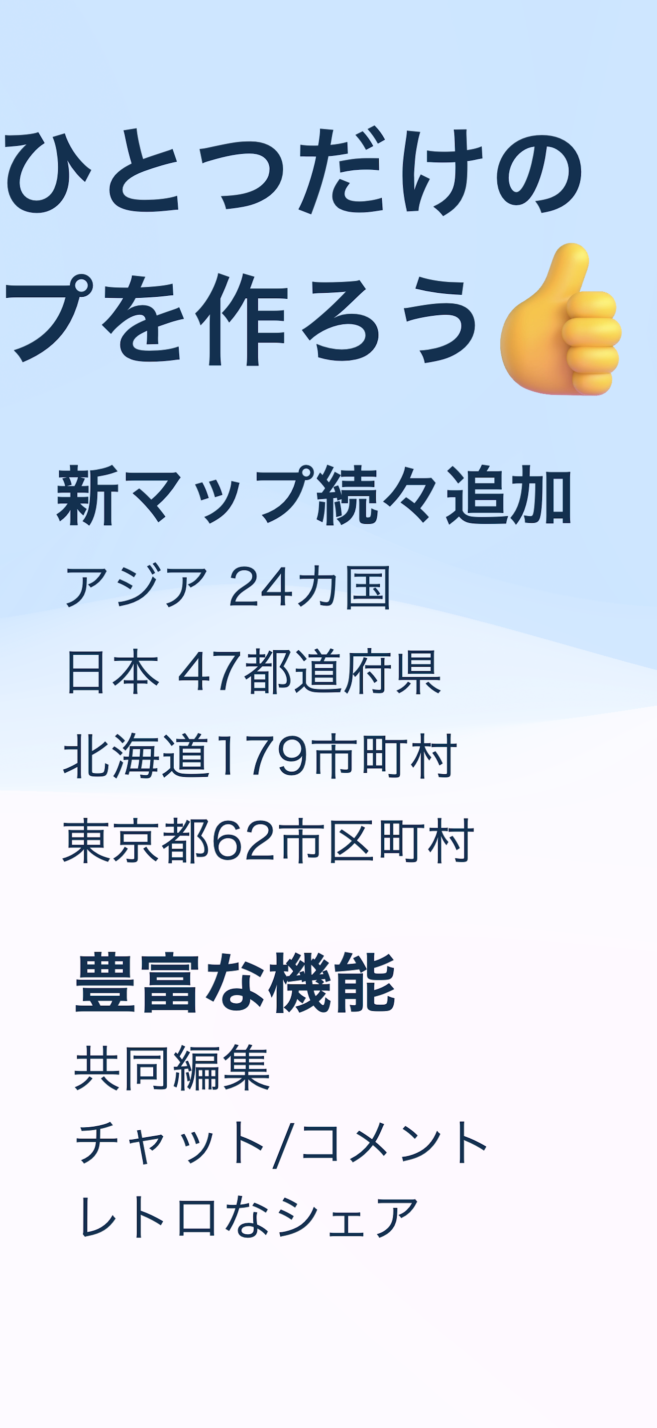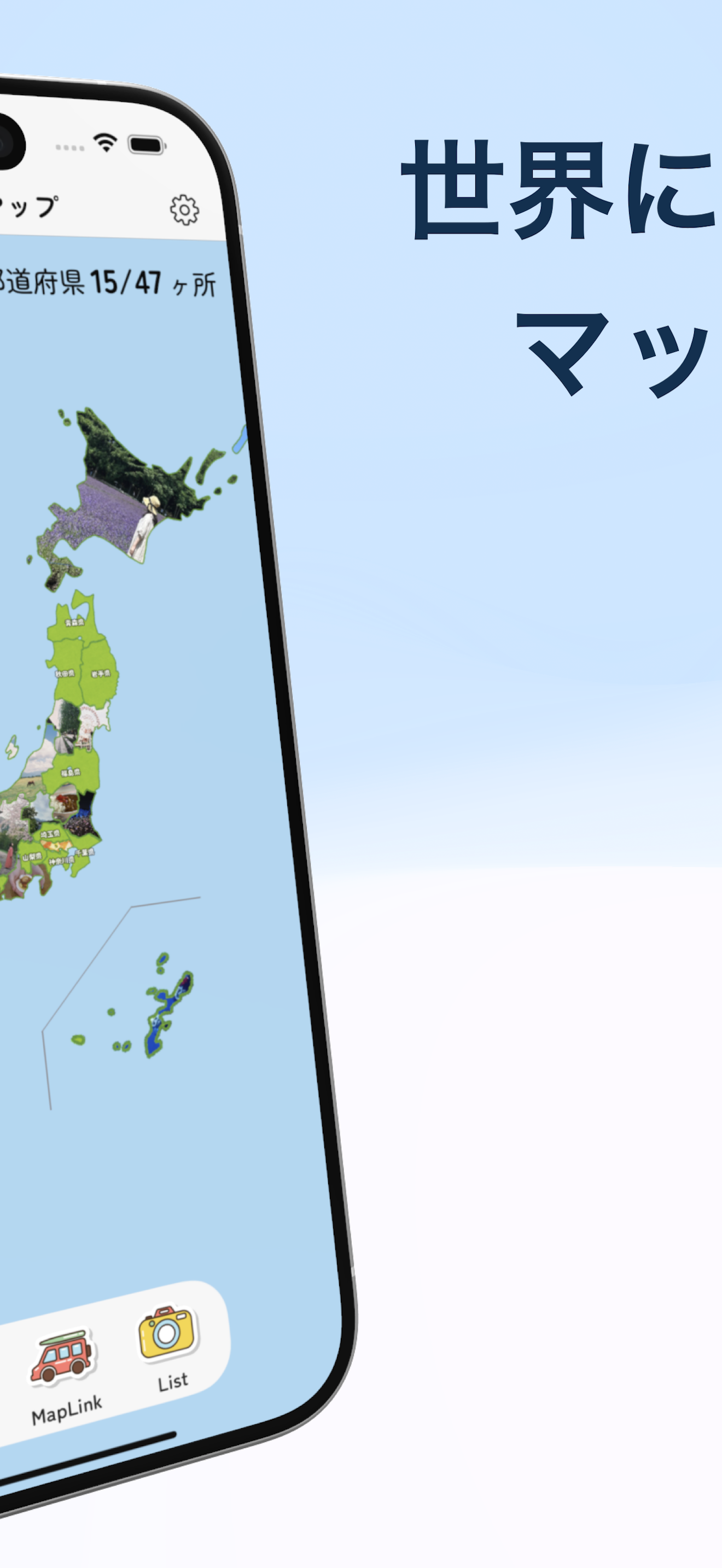 74,000 ダウンロード突破! 写真をパズルのように切り取って地図に記録することができるアプリ! 47都道府県を埋めるだけでなく、北海道179市町村、東京都62市区町村のマップもあるからディープなマップを作れちゃう! 主な機能 □ 日本、アジア、北海道、東京から好きなマップを作ろう! □ 都道府県の形に写真を切り取って地図に貼り付けよう! □ 友達や家族と一緒に思い出マップを共同編集できるマップリンクでシェアしよう! □ 投稿した写真にコメントして振り返ろう! ひとりでも複数人でも楽しめるよ!