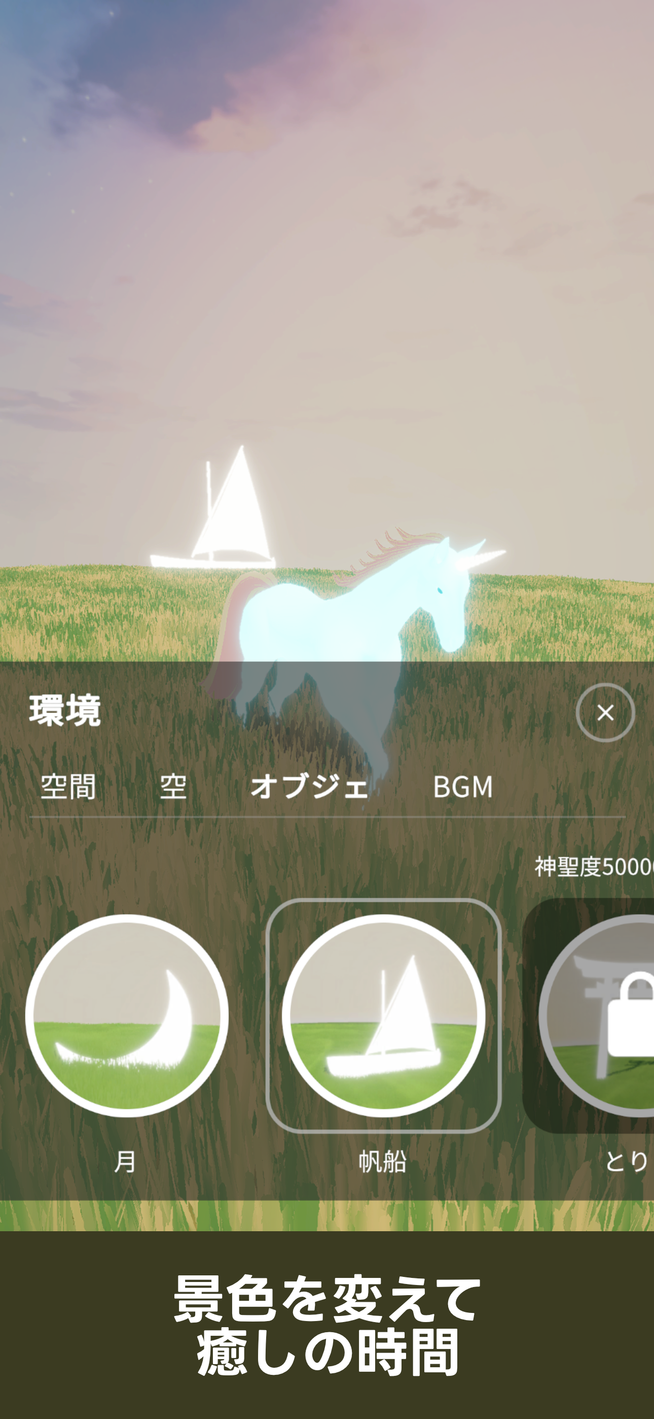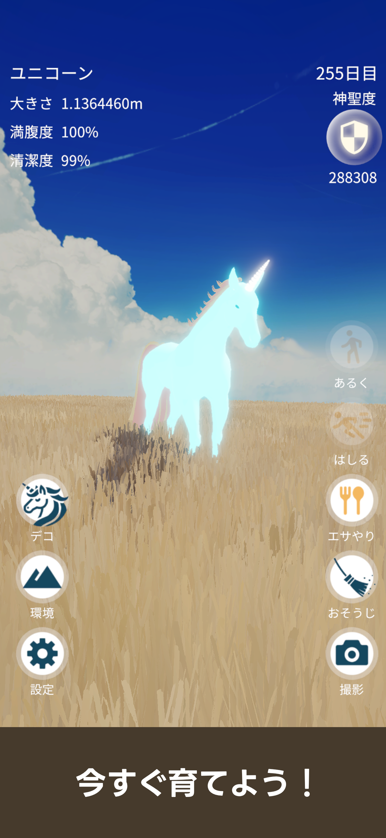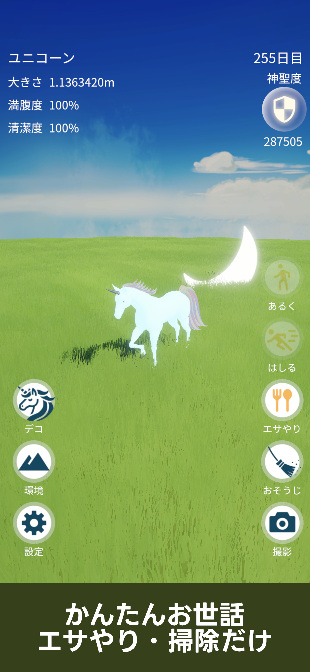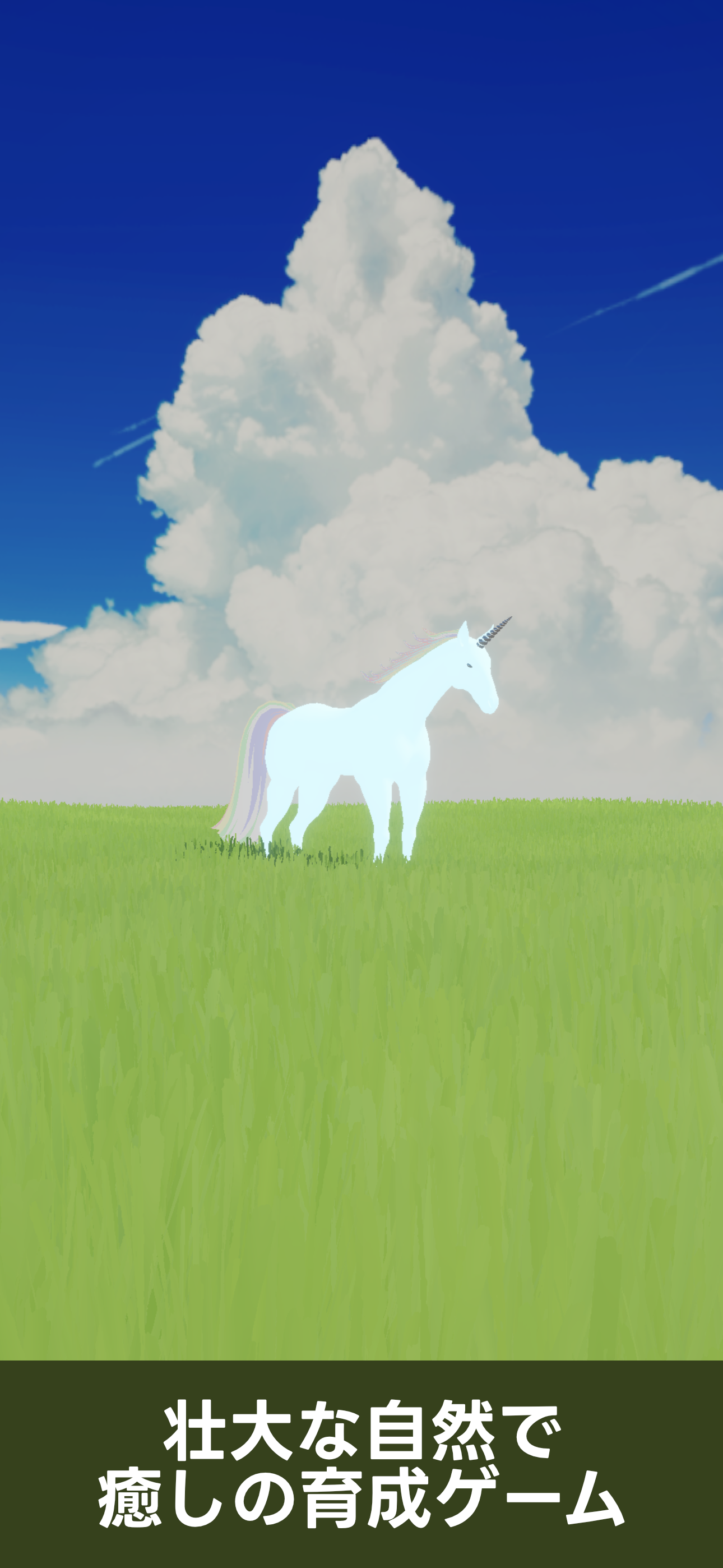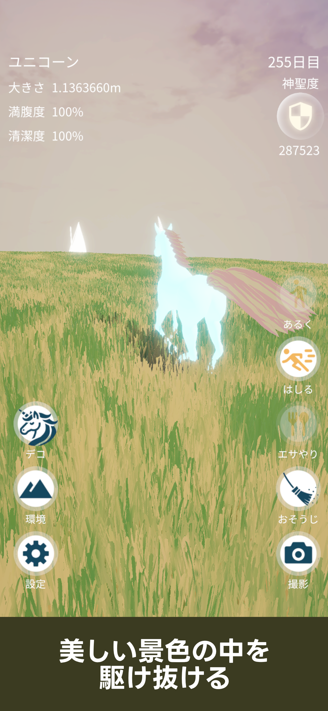 あなただけのユニコーンを育てる癒しの育成ゲーム 食べ物をあげたり、掃除をしたり、走らせたり 壮大な自然に包まれながら、癒しとリラクゼーションの時間を過ごせます