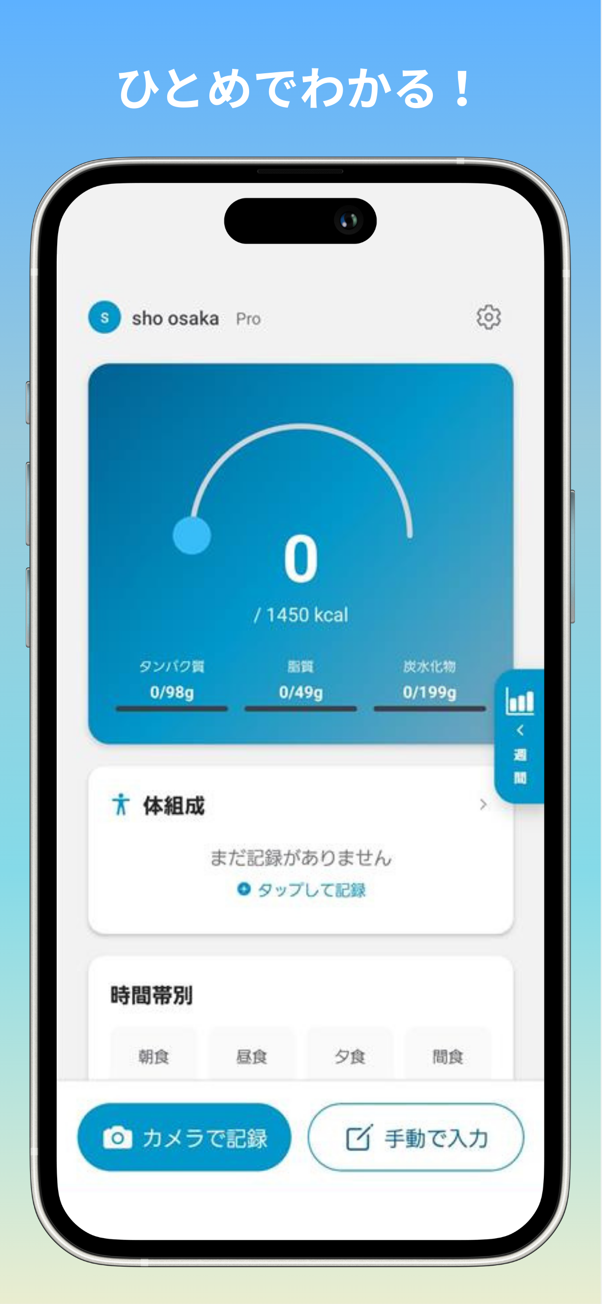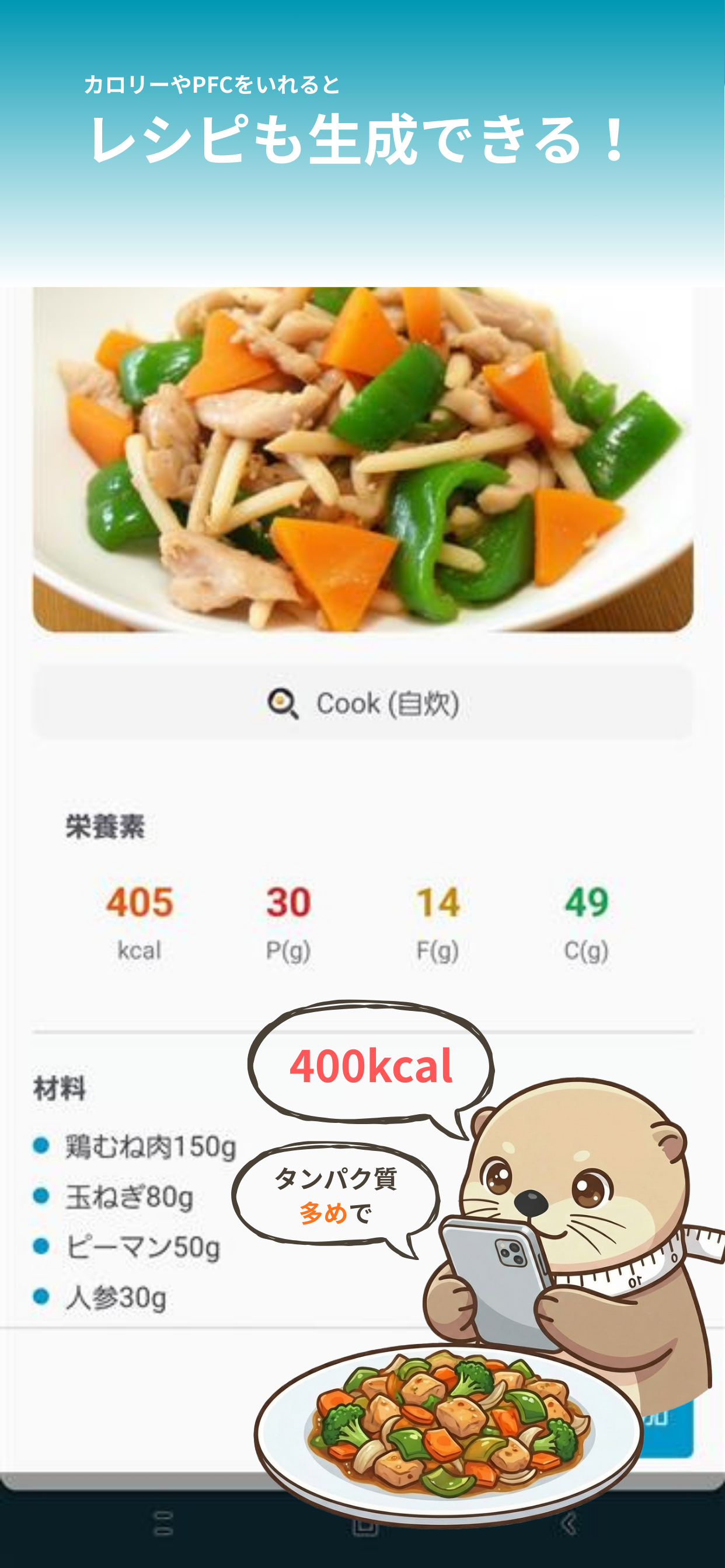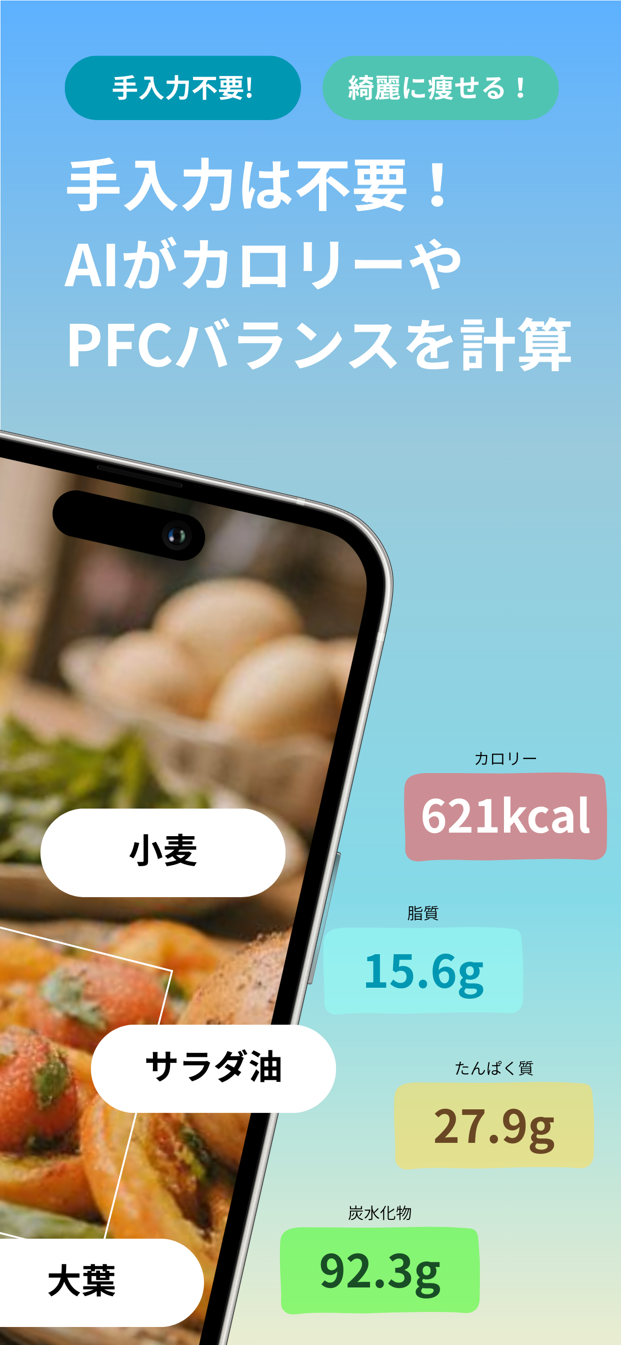 AI が食事を自動分析 食事を撮影するだけで、カロリーと栄養素を瞬時に記録。