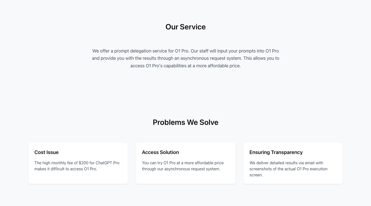 ChatGPT O1 proを手軽に試せるプロンプト代行サービスです! 🚀 ChatGPT O1 Proのような高度なAIを使ってみたいけど、 「月額$200はちょっと高い…」と感じたことはありませんか? そんな方に向けて、無駄なく必要な分だけ使えるシンプルなサービス を作りました。 🔗 サービスはこちら: https://tryo1pro.com/ Product Huntにも公開しています! https://www.producthunt.com/posts/try-o1-pro □このサービスのポイント ✅ コスパの良さ: 高額なサブスクリプション不要。必要なときに必要な分だけ利用可能です。 ✅ シンプルで透明な仕組み: 結果はスクリーンショット付きでメールにてお届け。 □こんな感じで使えます! 1. アカウントを作成: メールアドレスで簡単登録。 2. クレジットを購入: お試しプランから気軽にスタート。 3. プロンプトを送信: 質問やタスクを送るだけ。 4. 結果を受け取る: 出力結果とスクリーンショットがメールに届きます。 □ 料金プラン: トライアルプラン: ¥1,000 / 5クレジット まずは少しだけ試してみたい方に。 月額プラン: ¥7,500 / 150クレジット 継続して使いたい方におすすめです。 RedditでのPRもこれからやる予定ですが、うまく進める方法があれば教えていただけると嬉しいです!>< 🔗 サービスの詳細はこちらから: https://tryo1pro.com/