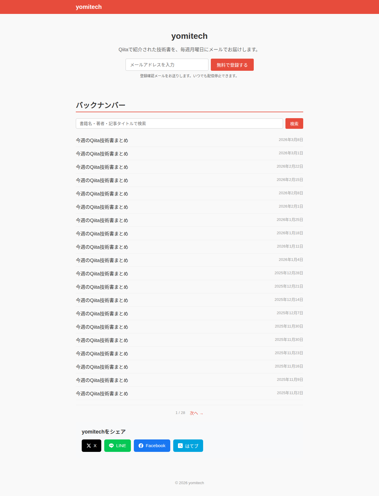 エンジニアの皆さん、こんな経験はありませんか? 「Qiitaで見かけた本、ブックマークし忘れた…」 「最近どんな技術書が話題になってるか知りたいけど、追いきれない」 「毎週自分で探すのは面倒だけど、良い本は見逃したくない」 そんな悩みを解決するために、Qiitaで紹介された技術書を自動で収集し、毎週月曜日の朝にメールでダイジェストをお届けします。