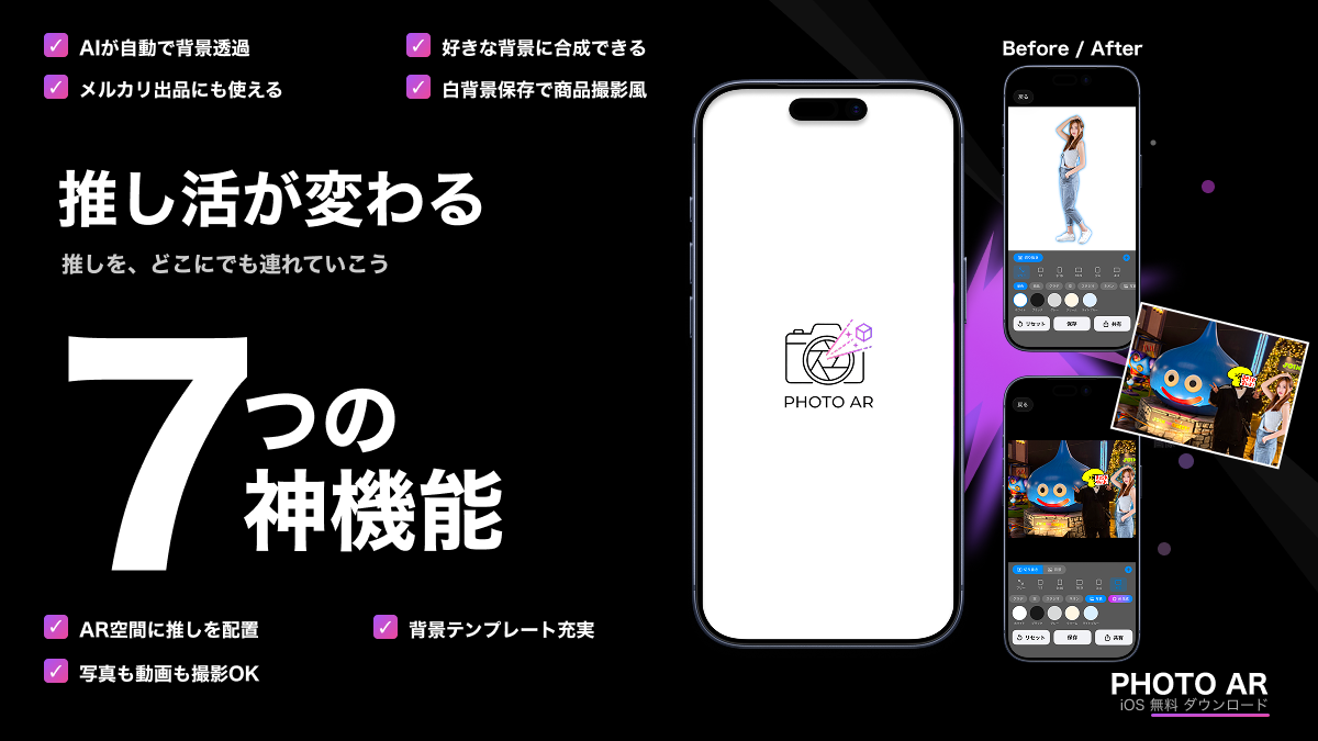 - - - - - - - - - - - - - - - - - - - こんな使い方ができます - - - - - - - - - - - - - - - - - - - ◆ 推し活に 好きなアイドルやキャラクターの写真を切り抜いて、ARで現実世界に配置。一緒にいるような写真が撮れます。背景合成で「2ショット風」の画像も作れます。 ◆ フリマ出品・物撮りに 商品写真をワンタップで切り抜き、白背景+ドロップシャドウ付きで保存。プロのような商品写真が誰でも簡単に作れます。 ◆ 証明写真・プロフィール写真に 背景を好きな色に変更。30種類のテンプレートから選ぶだけで、きれいな証明写真風の画像が完成します。 ◆ SNS・LINEスタンプ素材に 透過PNG書き出しに対応。切り抜いた画像はそのままLINEスタンプ素材やSNS投稿に使えます。 - - - - - - - - - - - - - - - - - - - 主な機能 - - - - - - - - - - - - - - - - - - - ● AI自動切り抜き 人物、ペット、物体をワンタップで背景除去。高精度AIがきれいに切り抜きます。すべてデバイス上で処理するのでプライバシーも安心。 ● AR配置カメラ 切り抜いた画像をARで現実世界の平面に配置。サイズ変更・回転・透明度調整が自由自在。LiDAR対応デバイスでは実物の後ろに隠れるオクルージョンも。 ● 背景合成 30種類のテンプレート(グラデーション、空、スタジオ、ネオン、商品撮影用など)から選ぶだけ。自分の写真やApple Intelligence対応デバイスならAI生成背景も使えます。 ● 奥行き合成 背景画像の被写体の前後に切り抜きを配置。自然な奥行き感のある合成画像を作れます。 ● 複数レイヤー合成 複数の切り抜きを重ねて自由に配置。レイヤー順序の入れ替えも簡単。 ● 白背景+影付き保存 商品写真に最適。ワンタップで白背景にドロップシャドウ付きの画像を保存。 ● 透過PNG書き出し 背景なしの透過PNG画像として保存・共有。 ● カメラフィルター AR撮影中にリアルタイムフィルターを適用。写真にも動画にも対応。 ● 動画撮影 AR空間を動画で撮影。切り抜き画像が現実に溶け込んだ映像を記録。 ● マスク手動編集 AI切り抜きの結果をブラシツールで微調整。細かい部分も思い通りに。 ● 高画質化(AI超解像) オンデバイスAIで切り抜き画像を高画質化。細部までくっきり。 - - - - - - - - - - - - - - - - - - -