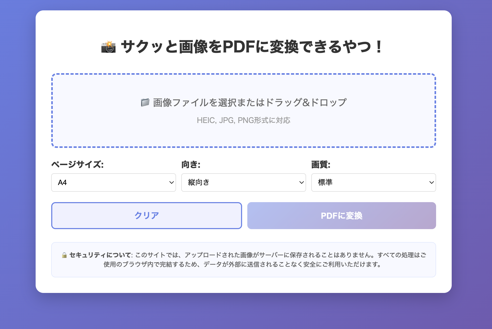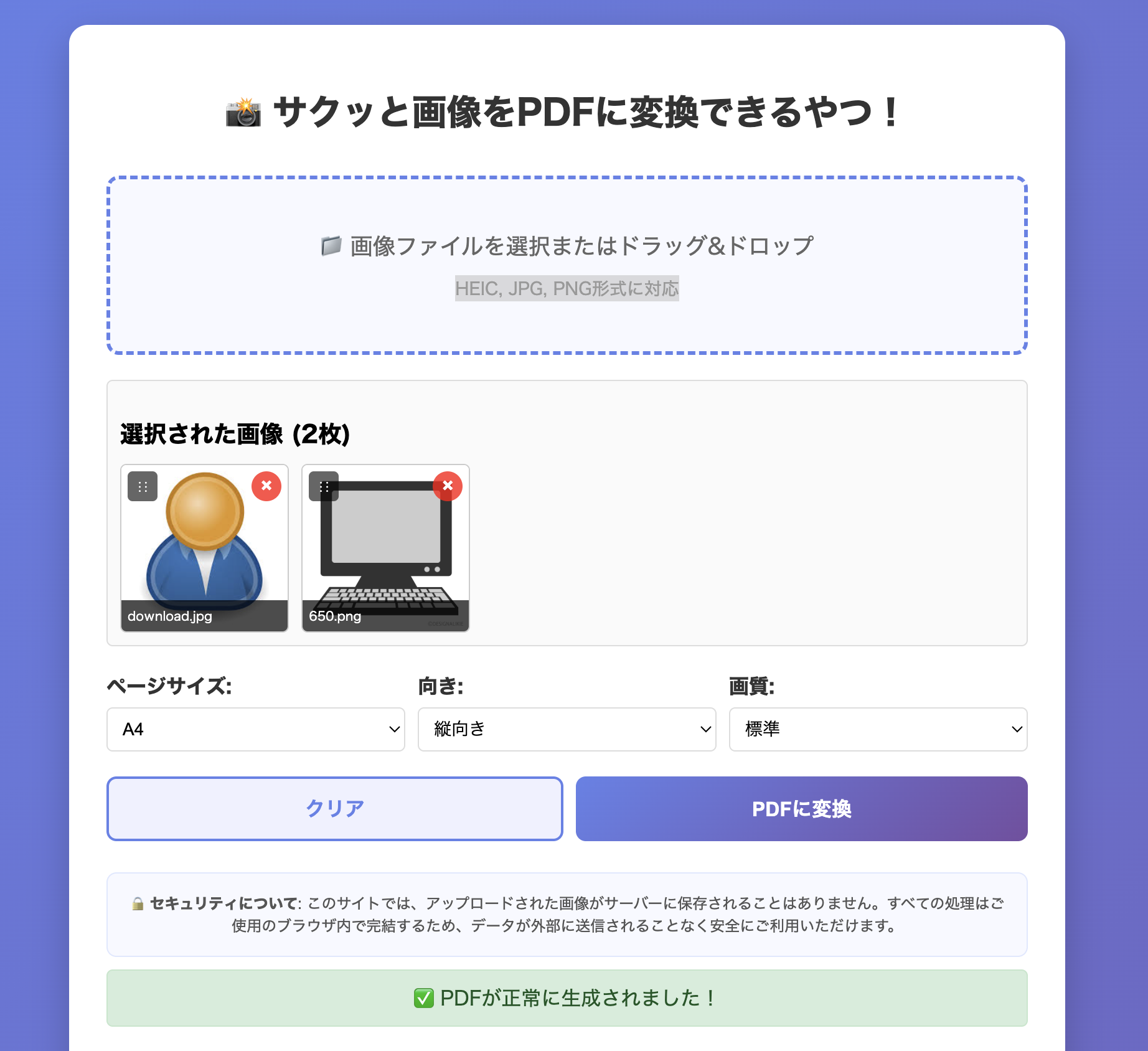 サーバー保存がなく「安全・高速・無料」で使える画像からPDFを作成できるオンラインツールです! HEIC形式の画像にも対応しており、複数画像ファイルをまとめてpdfにしたいときに便利です! ・画像の対応形式:「HEIC, jpg, png」 ・ドラッグアンドドロップに対応 【利用しているライブラリ】 ・heic2any ・jspdf ・pdf.js 【技術スタック】 ・html, css, javascript ・バイブコーディング(Claude、Gemini)