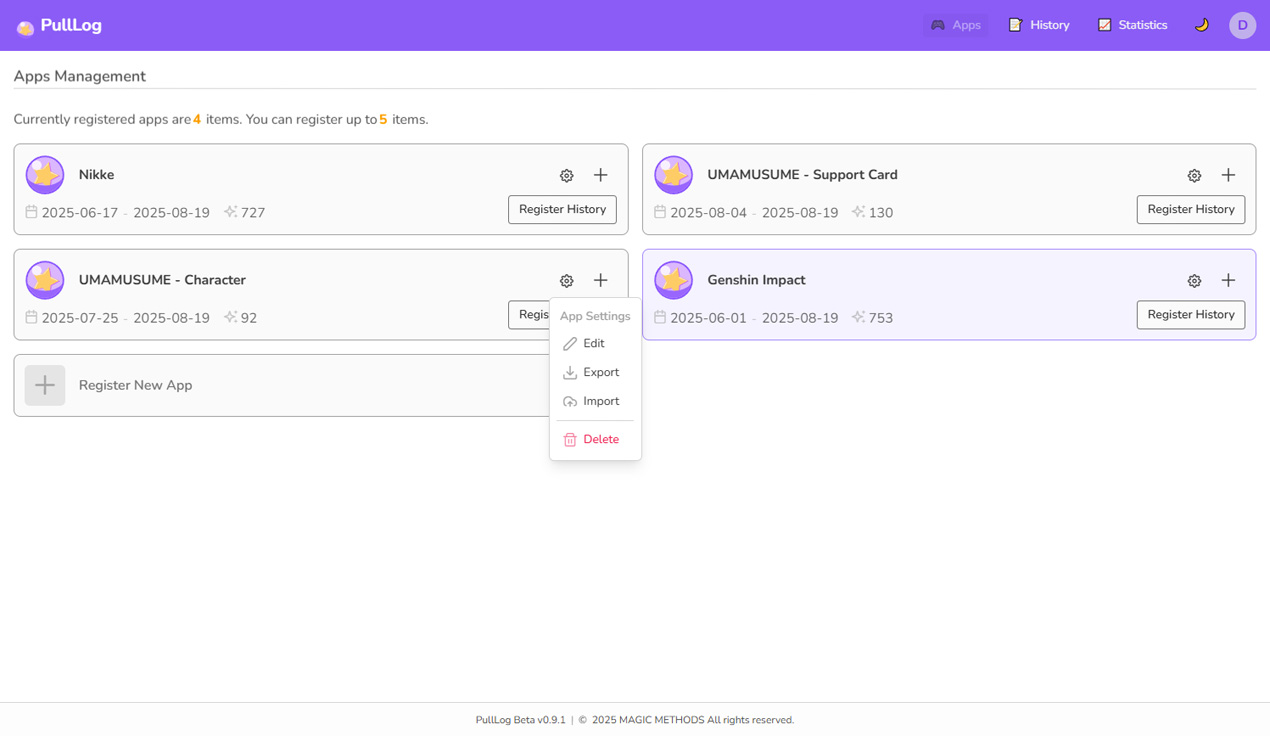ガチャのあるゲームで遊んでいると「このガチャにいくら使ったんだろう?」「本当のドロップ率はどのくらい?」と疑問に思うことはないですか。そんな悩みを解決するため、PullLogにガチャの履歴を記録しましょう。PullLogは獲得確率と出費を気にするプレイヤーをサポートするアプリです。 ログ記録を容易にし、支出とドロップ率を視覚化し、プレイヤーが自分の習慣をより深く理解するのに役立ちます。