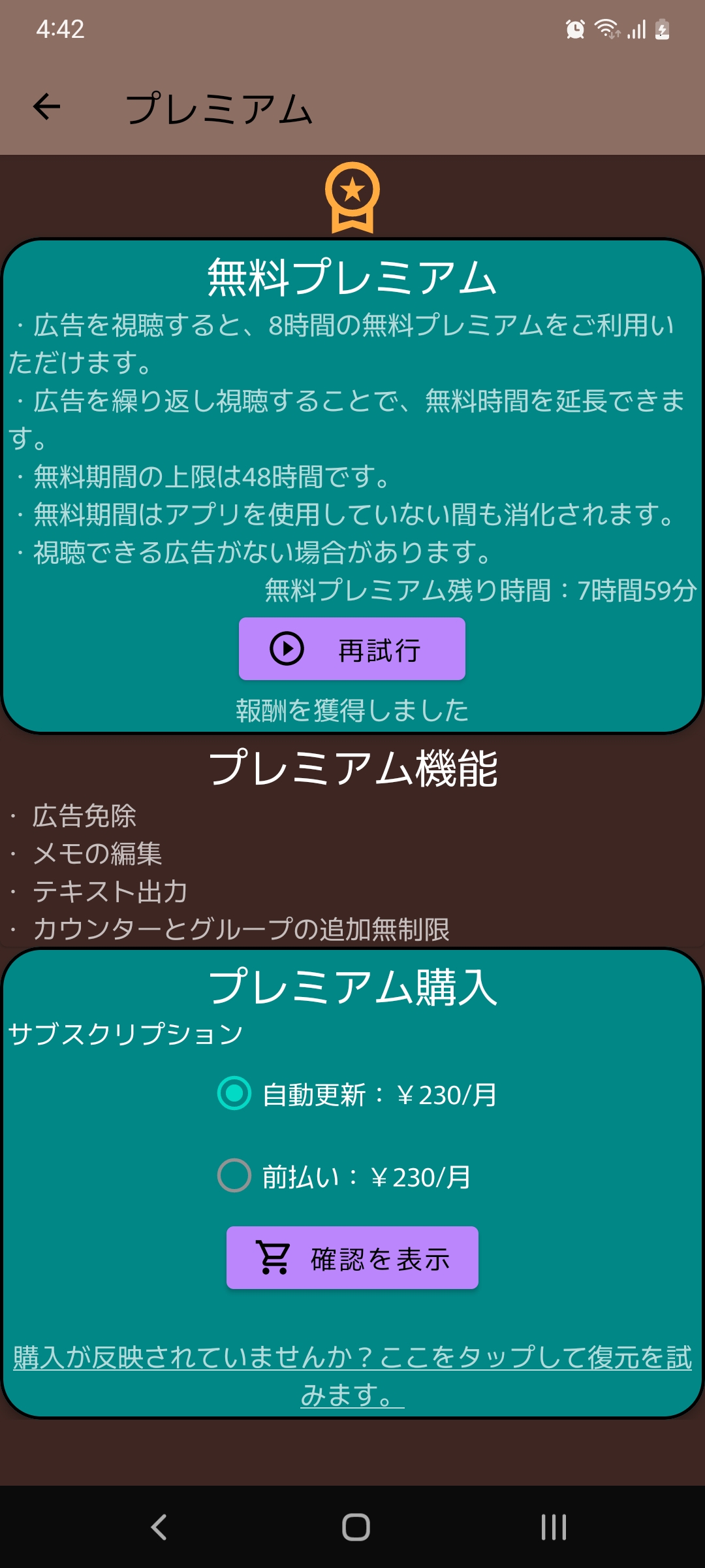 「膨大なカウンターアプリの中から自分に合ったものを探すのはもう疲れた」 なので!探さなくていいようにトップを取る意気込みで開発しました。(そうなる?) 無難なきっかけとしては、上位アプリを調査しても自分の望む機能がなかったり、微妙に揃ってなかったりするので自分用に開発を始めたということころです。 カウンターアプリは既に溢れかえっているほどのジャンルです。 開発者の私が自分のアプリをGooglePlayの検索で見つけようとしても見つけられないほど。 そりゃそうです、世界中のアプリ開発入門者が作る定番の一つでもありますから。 個人開発のモバイルアプリでお勧めされるスタイルは、次のものをよく目にするように思えます。 ・まずは数多くリリースしよう ・ニッチなジャンルを狙おう ・ニーズに合ったシンプルな構成にしよう 「これらに逆行するように思えるスタイルでどこまでやれるか?」へのチャレンジと言えるかもしれません。 さて、どうなるか? ツール系アプリに、リワード広告とサブスクの組み合わせを導入する参考にでもどうでしょうか?