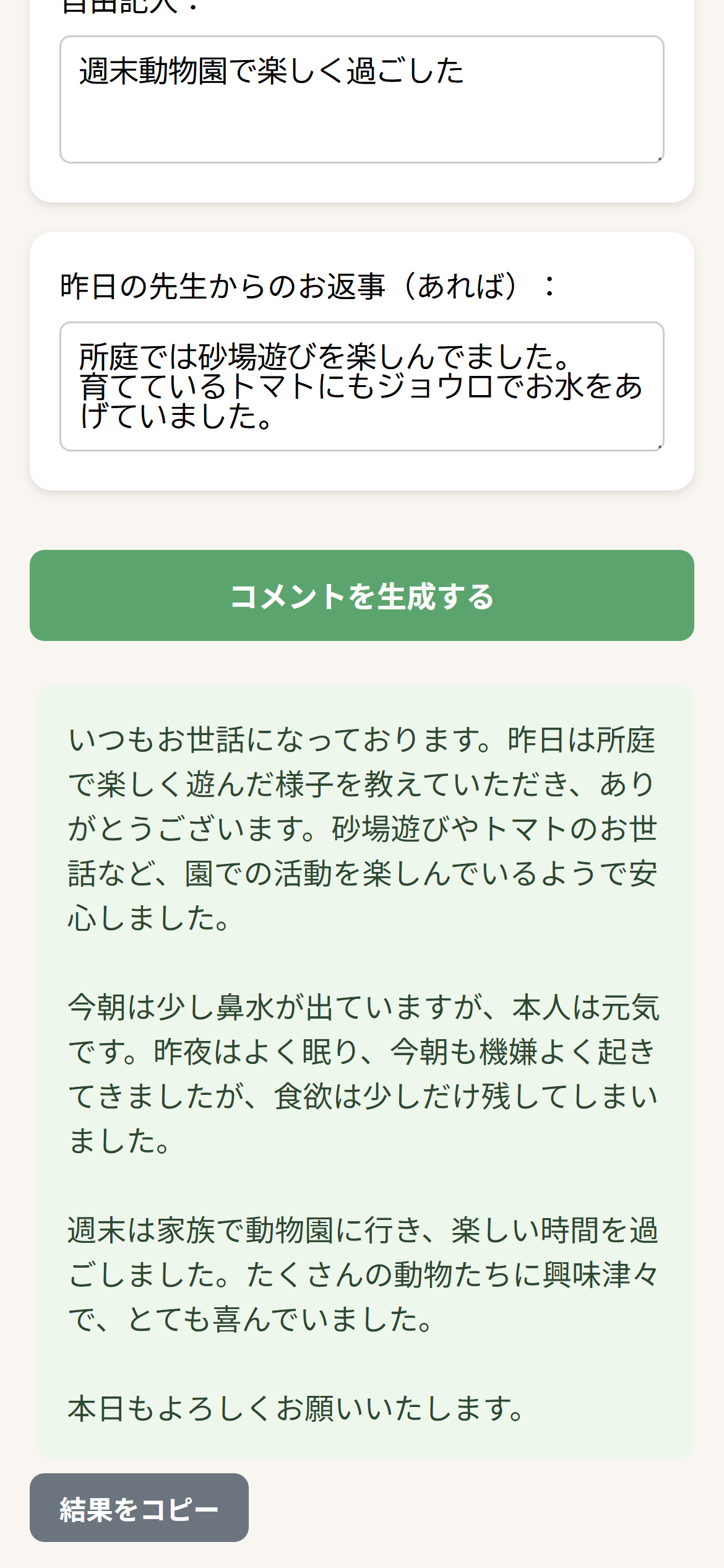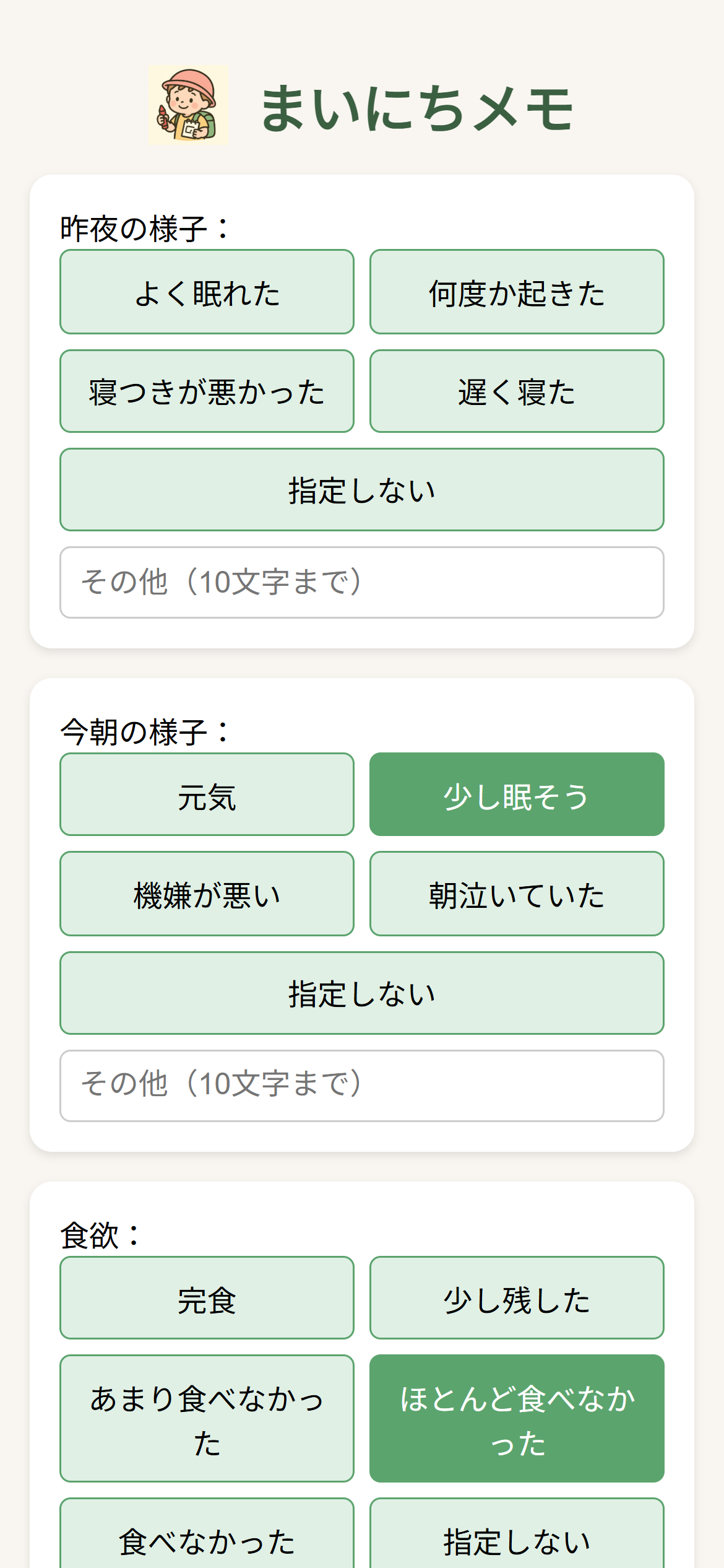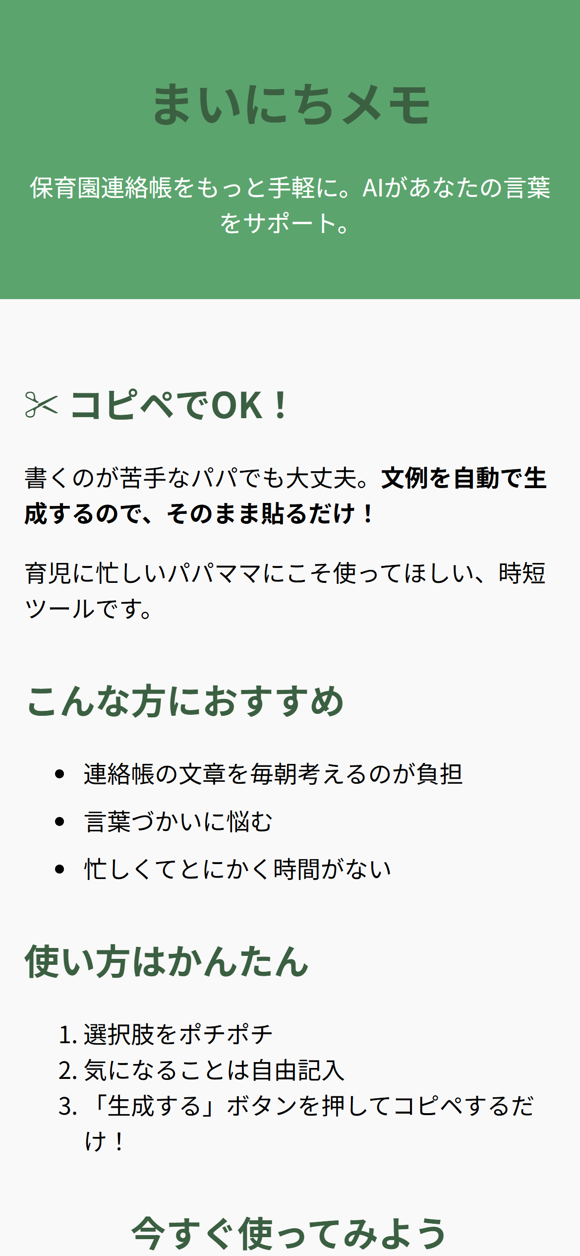 🌱 まいにちメモ 保育園連絡帳コメント生成ツール ✏️ 忙しい朝でも、30秒で「今日の連絡帳」が完成。 **「まいにちメモ」**は、忙しい朝でもサッと使える、保護者向けのWebツールです。 スマホで数項目をタップするだけで、自然で丁寧な日本語のコメントをAIが自動で作成。 保育園に提出する「今日の連絡帳」が、たった30秒で完成します。 🧸 開発の背景 育児と仕事を両立する保護者にとって、連絡帳の記入は地味に大変な毎朝のタスクです。 「子どもの様子をきちんと伝えたいけど、時間がない」 「毎日同じようなことを書いてしまう」 そんな悩みを解決するために誕生したのが『まいにちメモ』です。 🔍 主な特徴 ✅ スマホで完結。直感的なUI 「元気」「夜泣きあり」「少し眠そう」などをタップで選択するだけ。 文字入力が苦手でもサクッと記録できます。 ✅ 自然で丁寧な日本語をAIが自動生成 保育士に伝わりやすく、かしこまりすぎず失礼のないちょうど良い文章を自動作成します。 ✅ 保育士の昨日のコメントにも“返答”できる 前日の先生からのメッセージに対して、感謝や気づきを含んだ返答文を生成。 温かなやりとりをサポートします。 ✅ ワンタップでコピー。すぐ貼り付けOK 生成されたコメントは、園指定アプリにコピーしてそのまま利用可能です。手書きの方も、生成されたコメントを参考にできます。 ✅ パパママどちらでも使える文体 父親が使っても違和感のない表現を意識。 「家ではこうでした」と気軽に伝えられる文章にしています。 📈 今後の展望(開発予定) 📷 写真から先生のコメントを自動文字起こし スマホカメラで昨日の連絡帳を撮影するだけで、文字起こし→自動返答まで可能に。 📊 毎日の記録をグラフで可視化 「先週は何日完食した?」「夜泣きが多かったのはいつ?」などを、統計で見える化します。 ✍️ 文例の“複数提示”機能 シチュエーションに応じて複数の文例を提示し、選んで使えるようになります。 💬 文体・口調のカスタマイズ 「フォーマル」「フランク」「シンプル」など、保護者ごとに口調を選べる機能を追加予定。 🌟 最後に 「まいにちメモ」は、育児中の“今だけの時間”を少しでも楽に、そして心に余裕をもって過ごせるように―― そんな思いから生まれました。 誰でも気軽に使えて、継続しやすい。 これからも保護者と保育士のあいだのやさしい橋渡しとなるよう、進化を続けていきます。 📱 いますぐお試しください。あなたの毎日に、ほんの少しの“ゆとり”を。