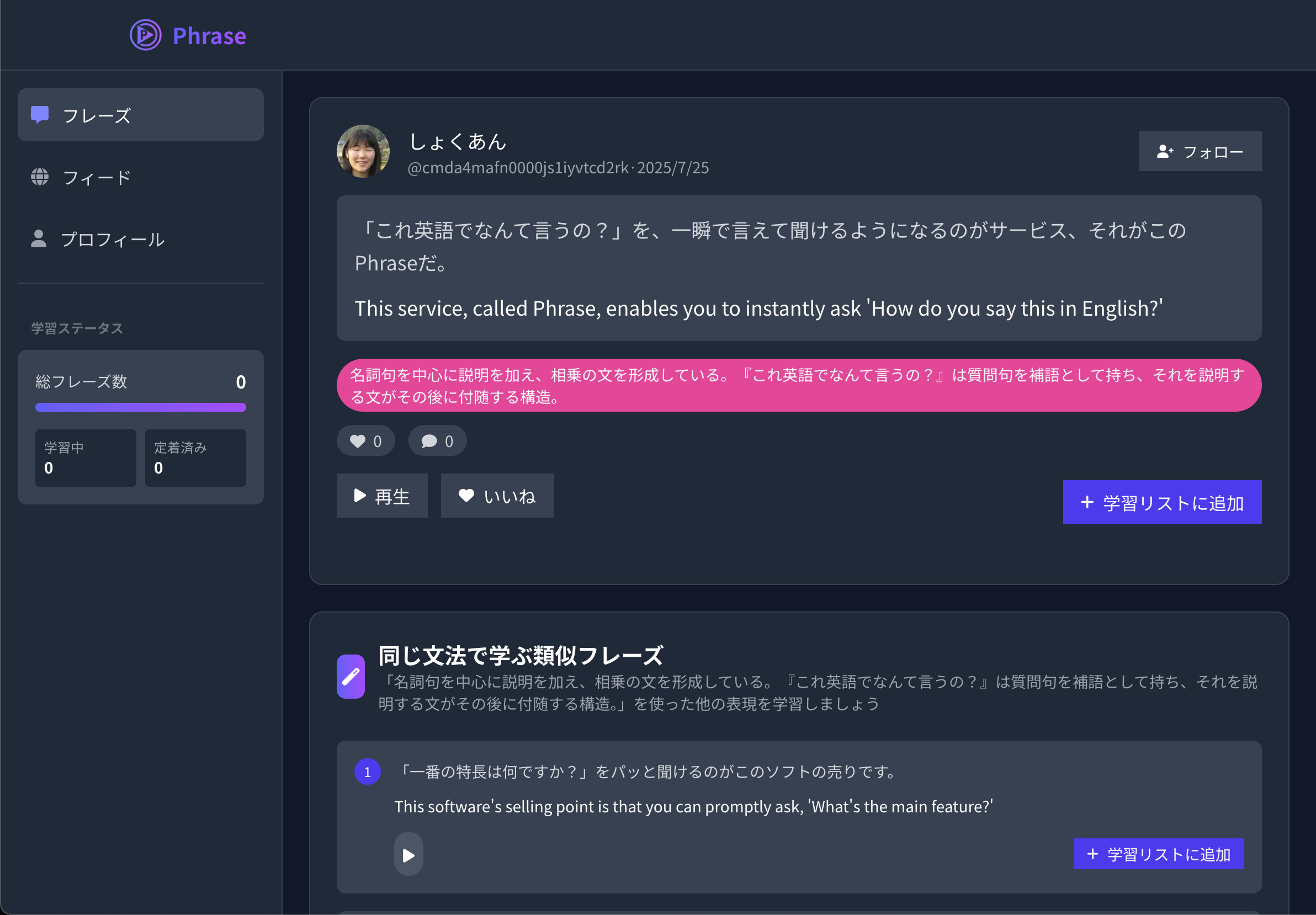# 📚 Phrase(フレーズ) **「これ英語でなんて言うの?」を、一瞬で言えて聞けるようになる** 音声学習 × AI 英作文 × 文法トレーニングの新しい英語学習体験 ## 🧠 プロダクトの目的 「これ英語でなんて言うの?」を、一瞬で言えて聞けるようになる 音声学習 × AI 英作文 × 文法トレーニングの新しい英語学習体験 ## 🚀 強みと差別化ポイント ✅ **ユーザー主導の英語学習**:「言いたいこと」から始まるから定着力が高い ✅ **音声中心 UX**:英文・和訳を TTS で再生。シャドーイングにも最適 ✅ **マッスルメモリーを鍛える構造学習**:同じ文法の例文を 10 個生成して反復再生 ✅ **日本語だけで OK**:言いたいことを書くだけ。シンプルなUX