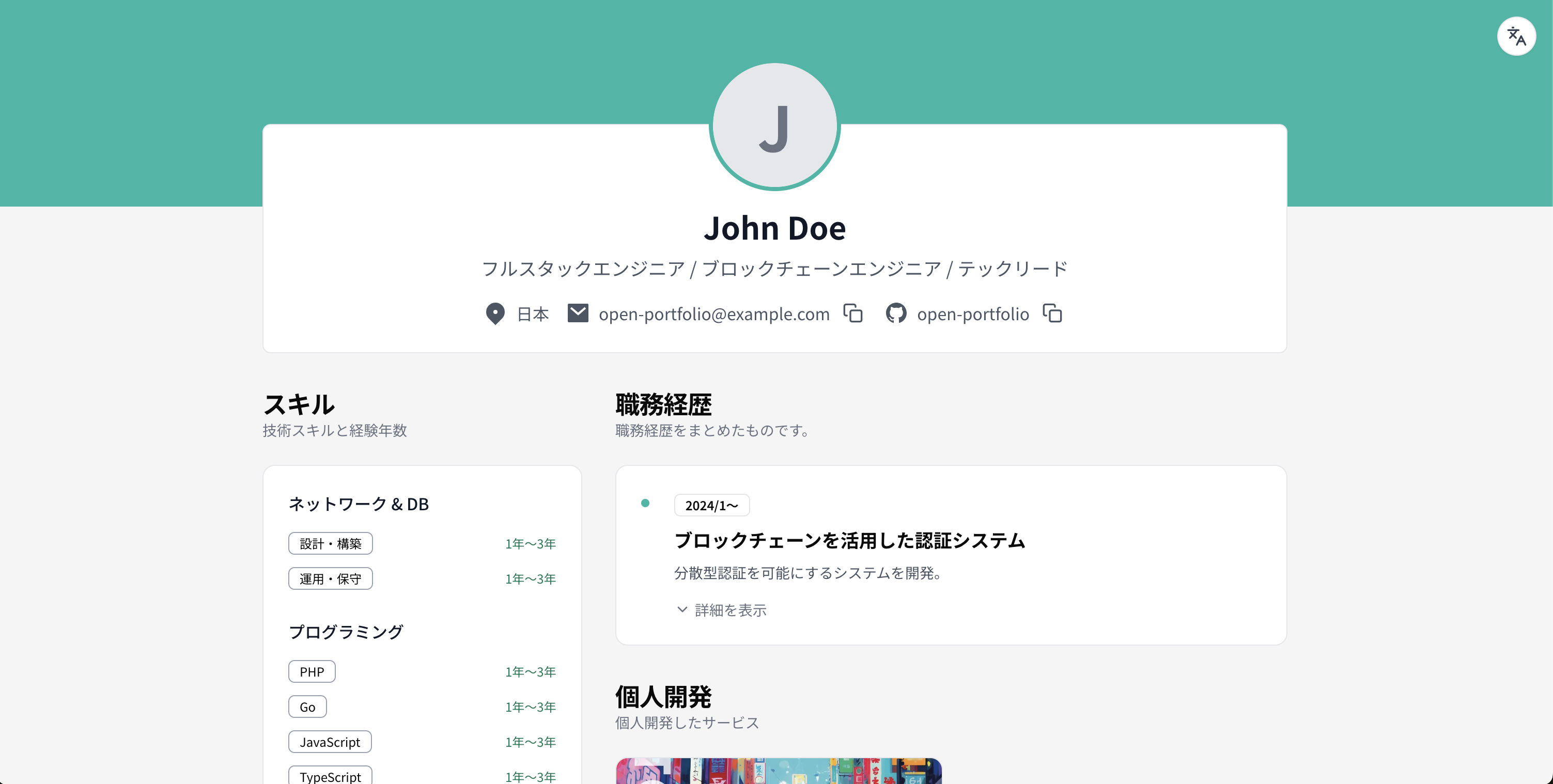 Open Portfolioはオープンソースのポートフォリオサイトです。データベース不要でNextjsで作成されたモダンなポートフォリオサイトを簡単に自身の環境に構築できます。独自のデザインにカスタマイズして利用いただくこともできます。