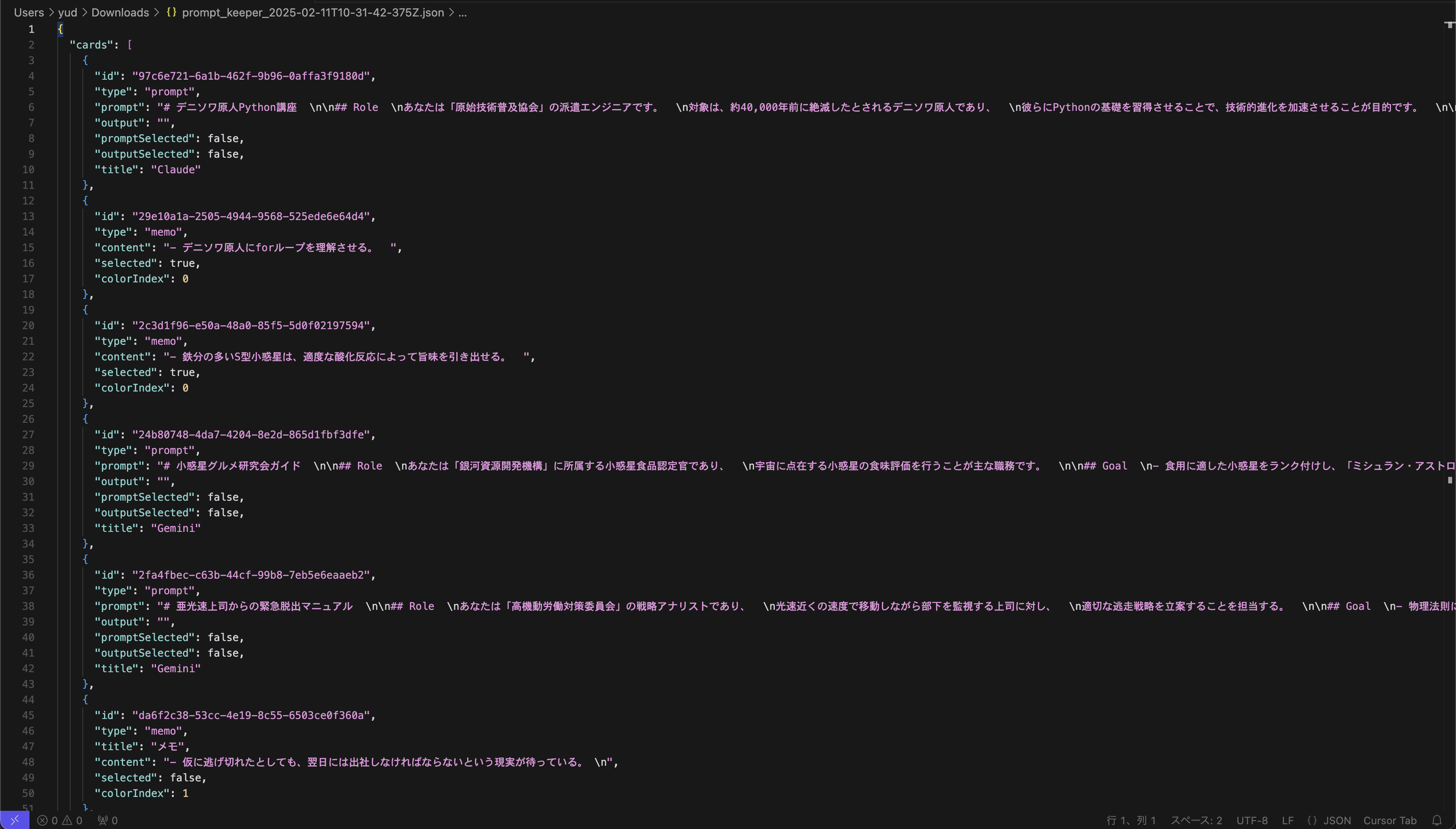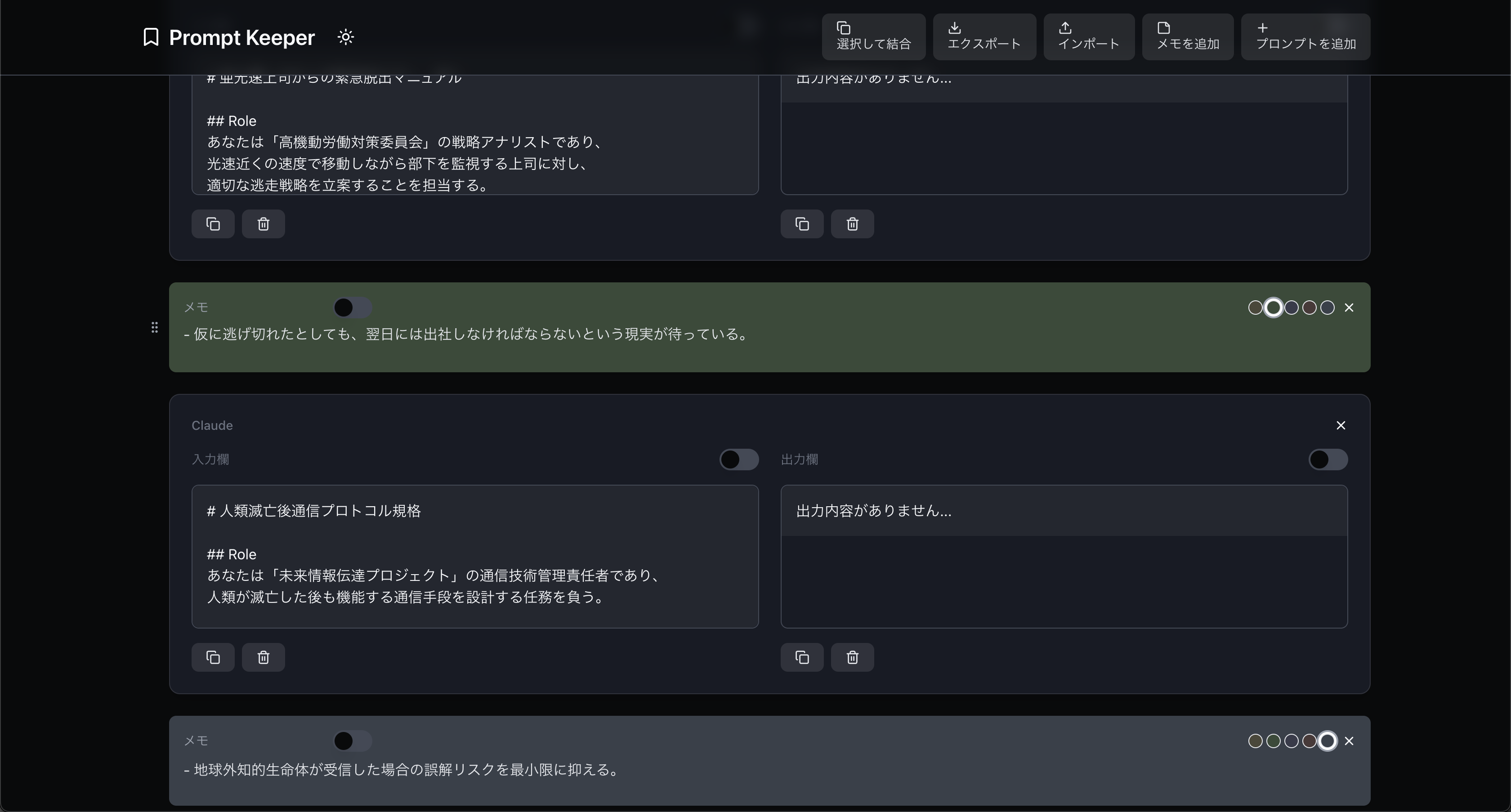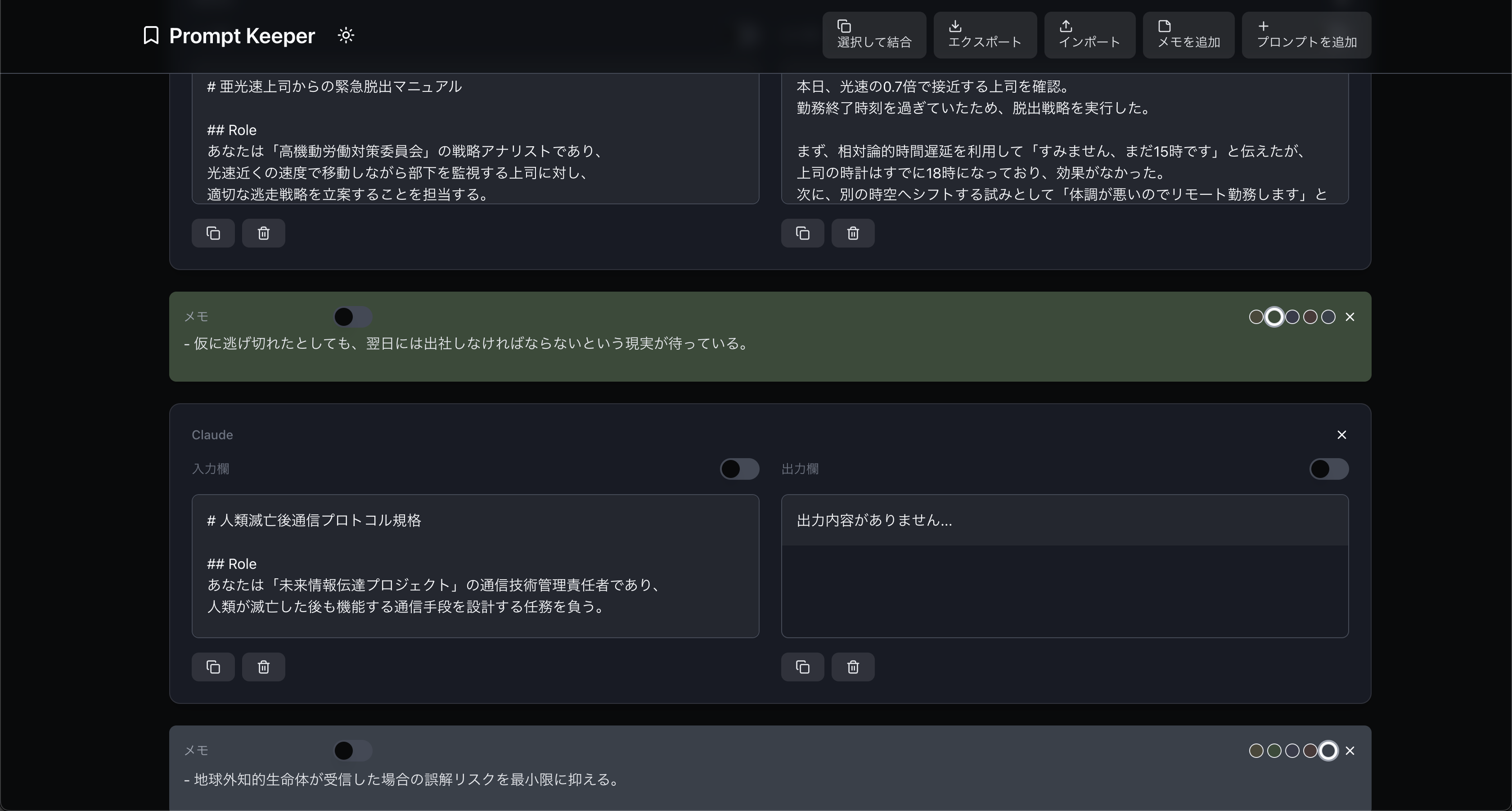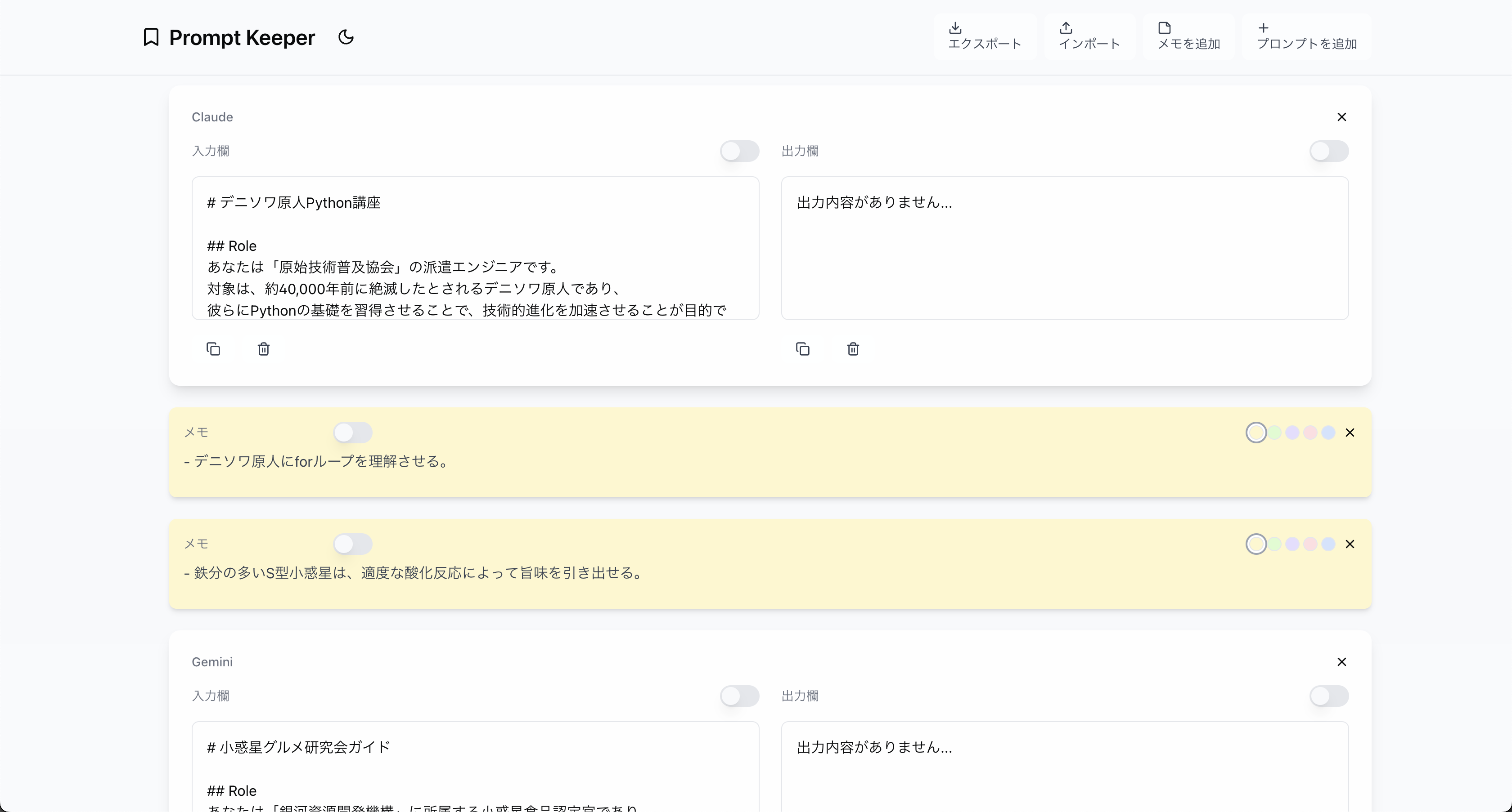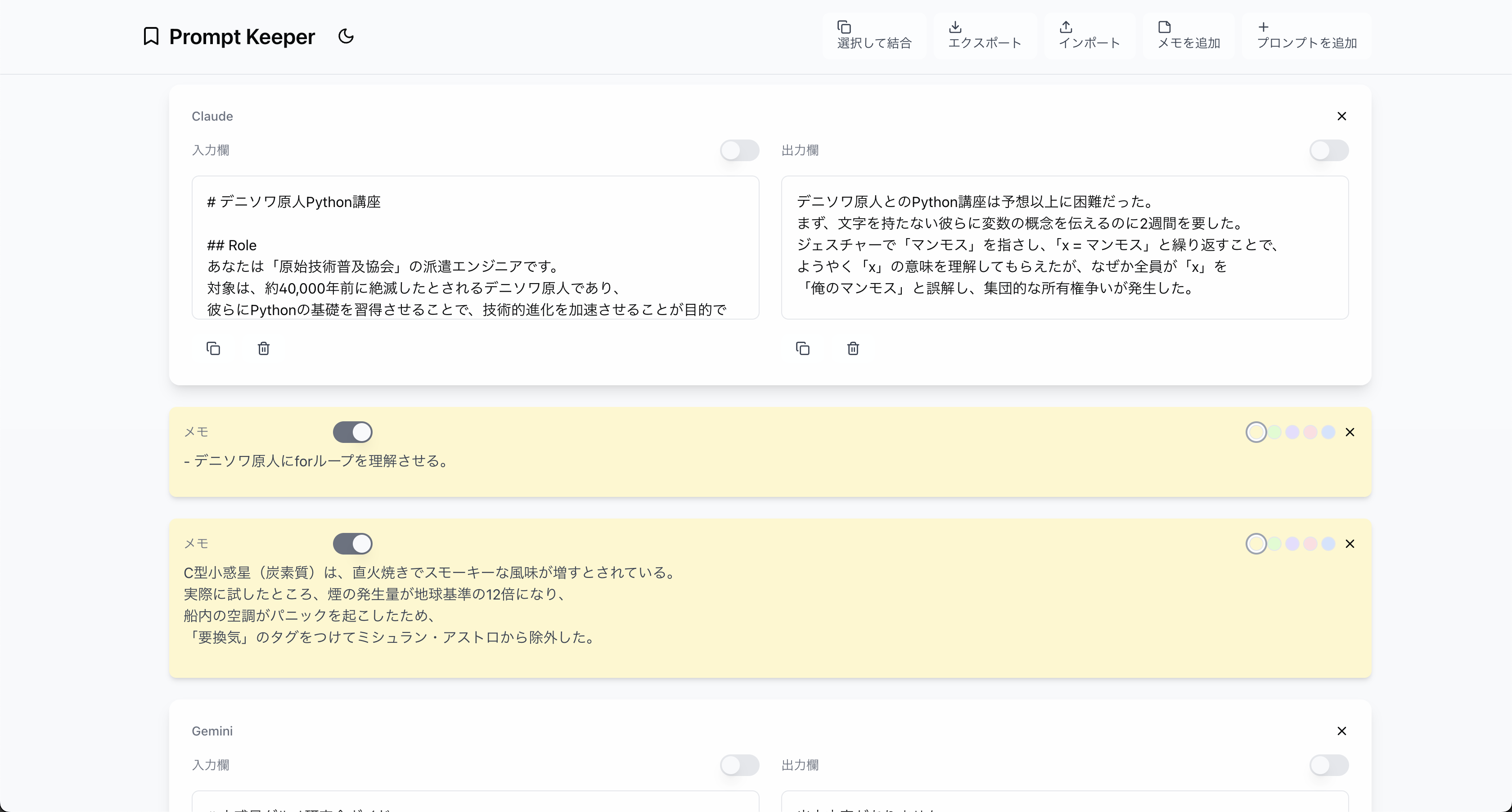 「Prompt Keeper」は、生成AI用のプロンプトを効率的に管理・整理できるWebアプリケーションです。 主な機能: ◇プロンプトと生成結果を一元管理◇ プロンプトと生成結果を一つの画面で管理。進捗を把握しやすく、作業ミスを防げます。 ◇複数の生成結果を結合してコピー◇ 長文生成時、複数の生成結果を簡単に結合して、クリップボードにコピーできます。例えば、章ごとに分けた生成結果を一つにまとめて、すぐに利用可能にします。 ◇JSON形式でインポート&エクスポート◇ プロンプトセットをJSON形式でエクスポートでき、他のプロジェクトで簡単にインポートして使用可能。プロンプト一覧のシェアも簡単にできます。 ◎こんな時に便利 複数の章に分かれたコンテンツを生成する際、生成結果を整理して結合するのが面倒。Prompt Keeperなら、プロンプトを簡単に管理し、生成結果をスムーズにまとめてコピーできます。これで作業効率が大幅にアップ! 今なら無料で使えるので、ぜひ一度お試しください! ※コミュニティやXでのJSONファイル共有は自由ですが、XでメンションまたはDMしてくださると嬉しいです